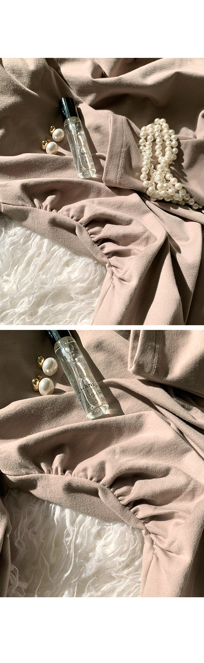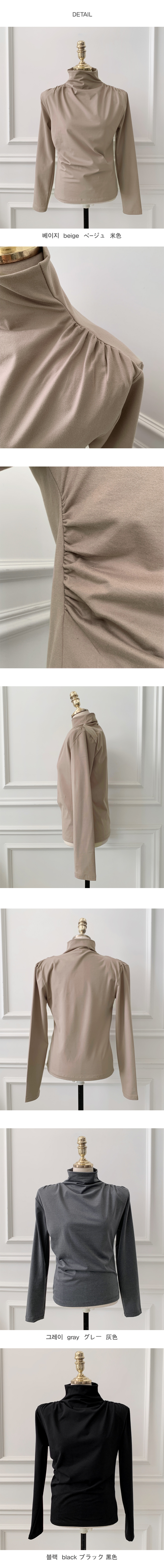 어깨부분에는 주름이 자연스럽게 잡히는 셔링을 넣었기 때문에, 따로 핏을 만져주지 않아도 자연스러운 느낌으로 핏이 연출되서 예쁘게 착용 가능하실거예요.