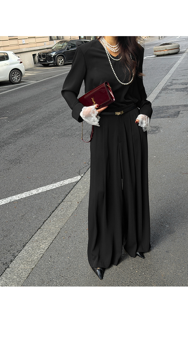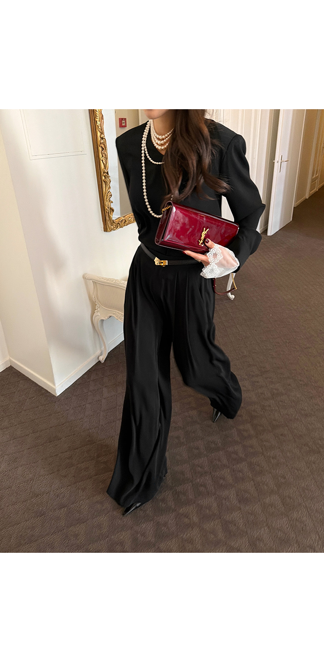 프론트에 더해진 핀턱 디테일이 자연스럽게 여유 있는 실루엣을 만들어