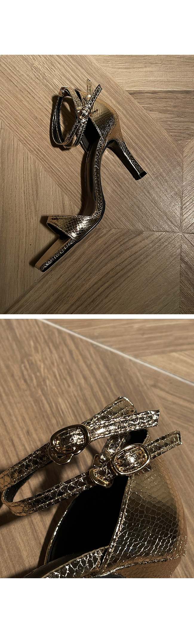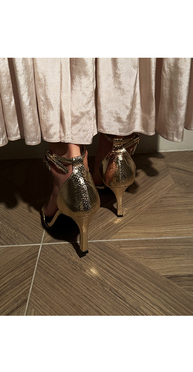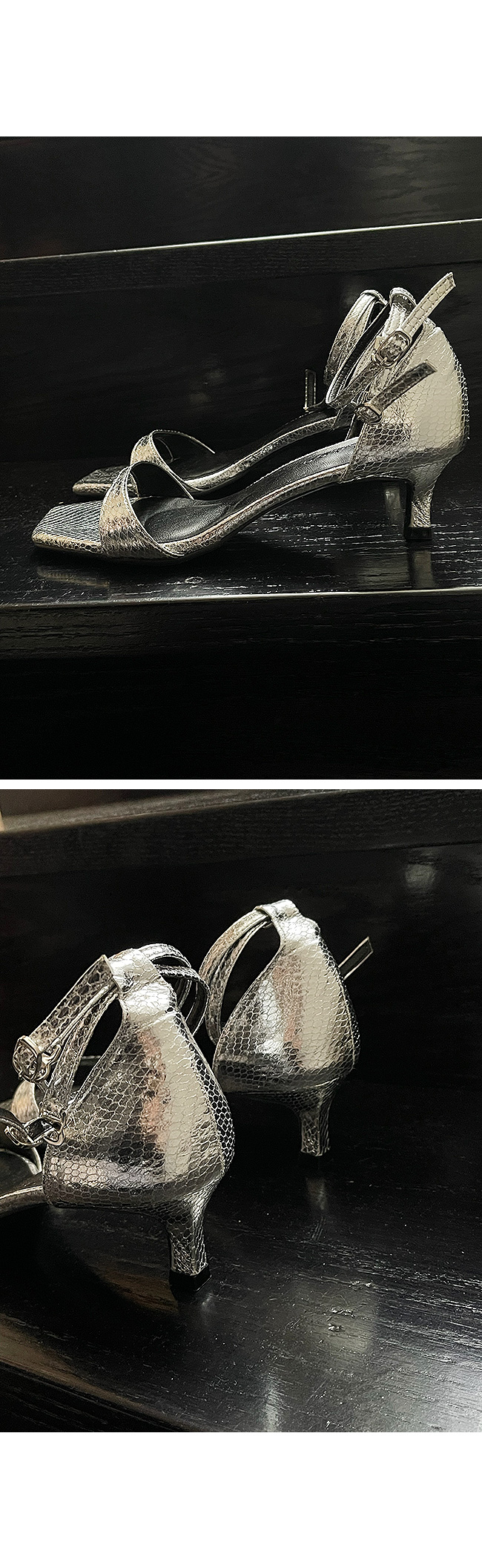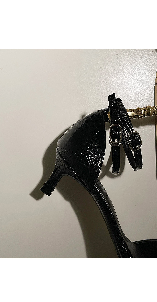 은은한 광택에 스네이크 패턴의 텍스처가 돋보이는 이 슈즈는,