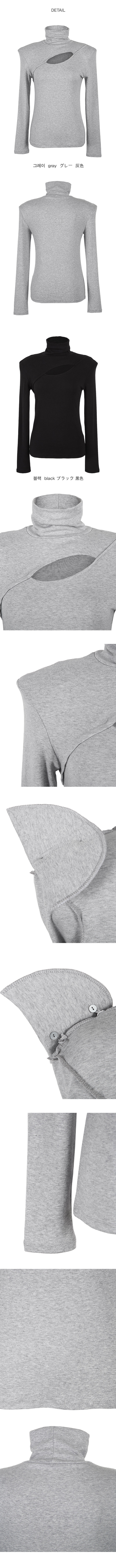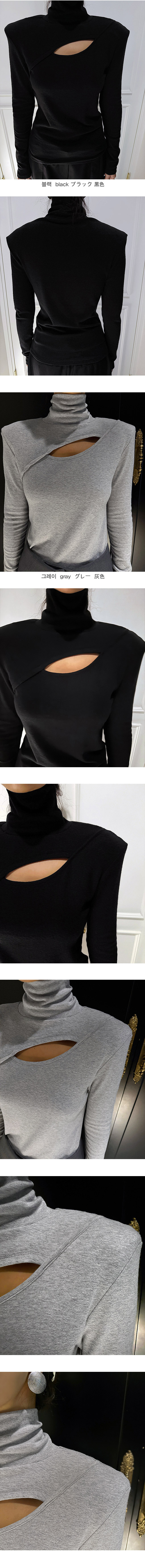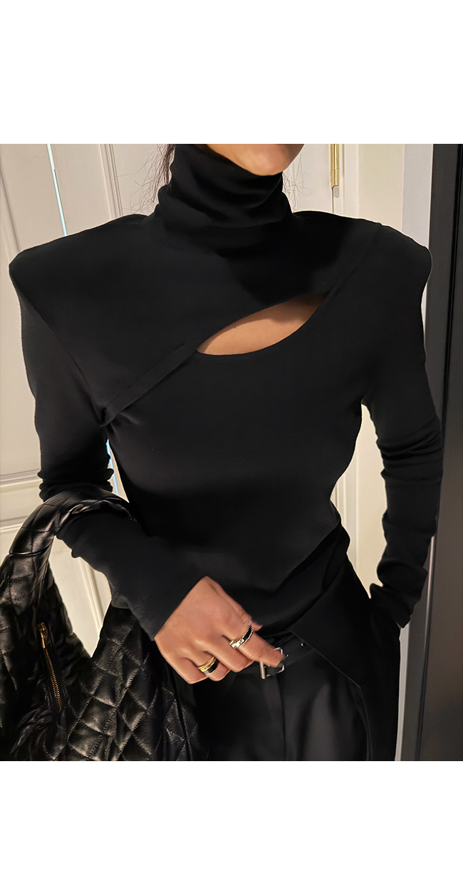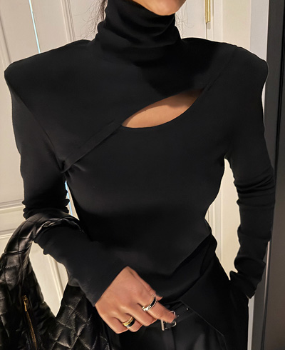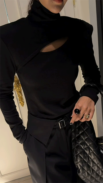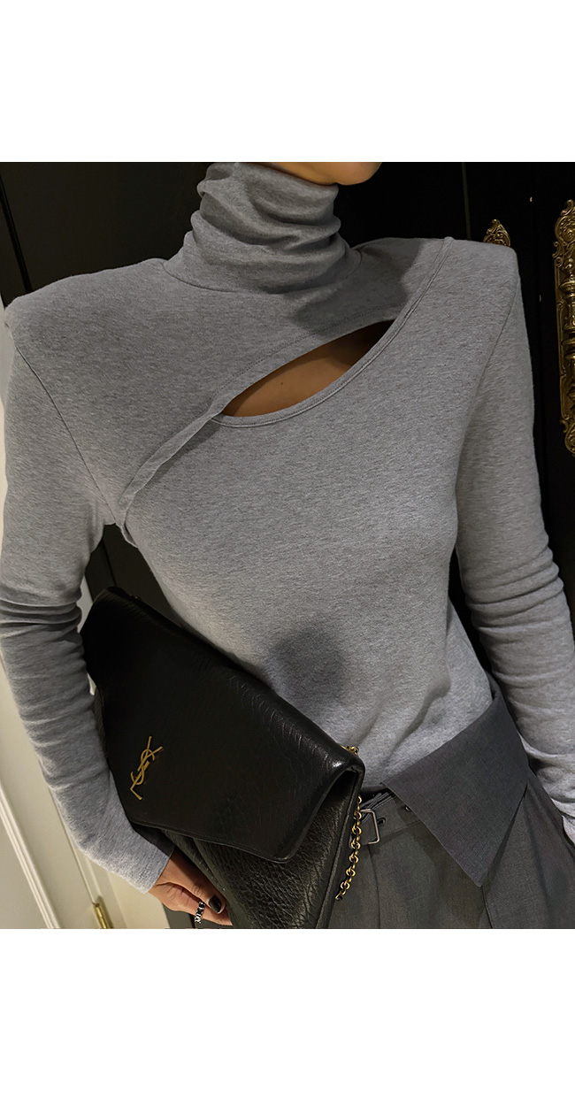 어깨 라인부터 이어지는 절개와 가슴 위로 드러나는 컷아웃이
