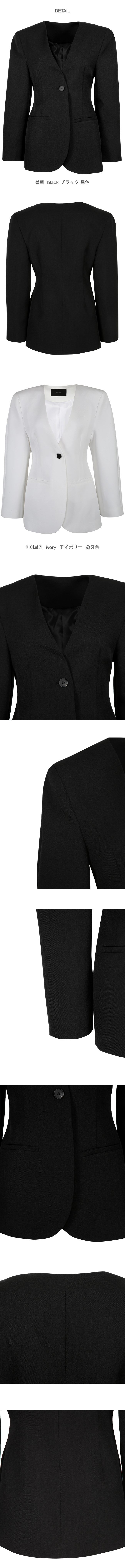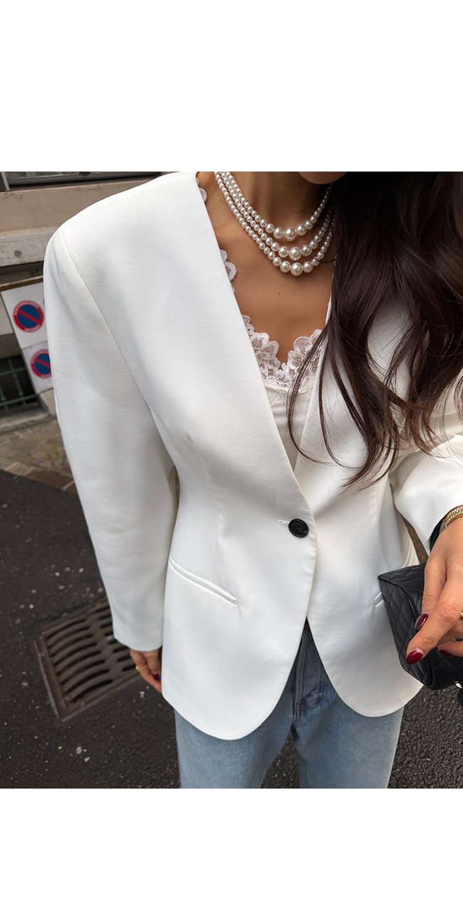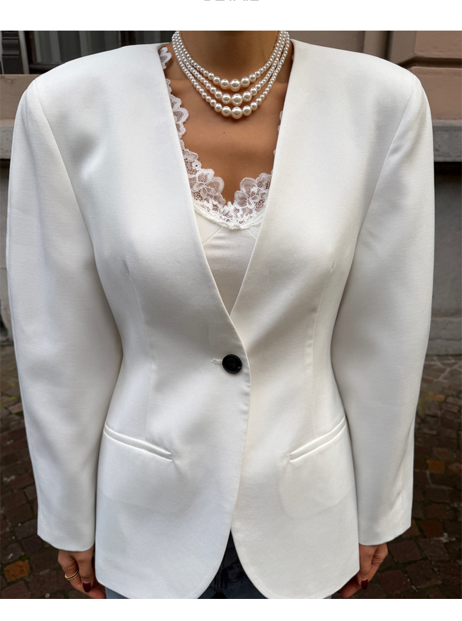깊게 파인 브이넥 라인과 함께 이어지는 싱글 버튼 여밈이