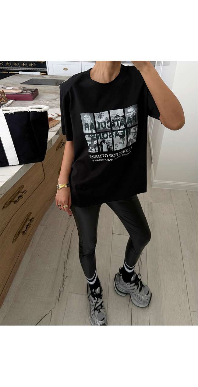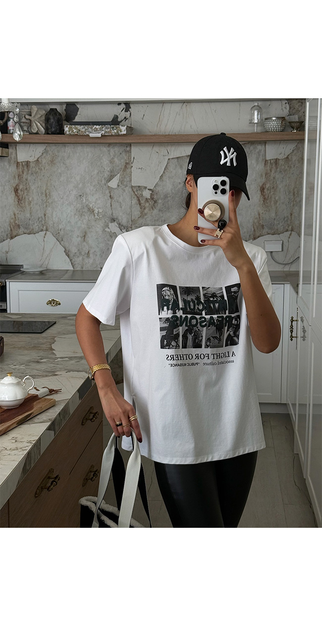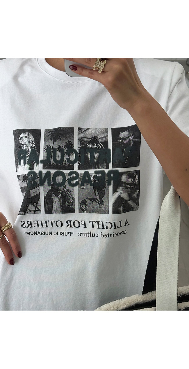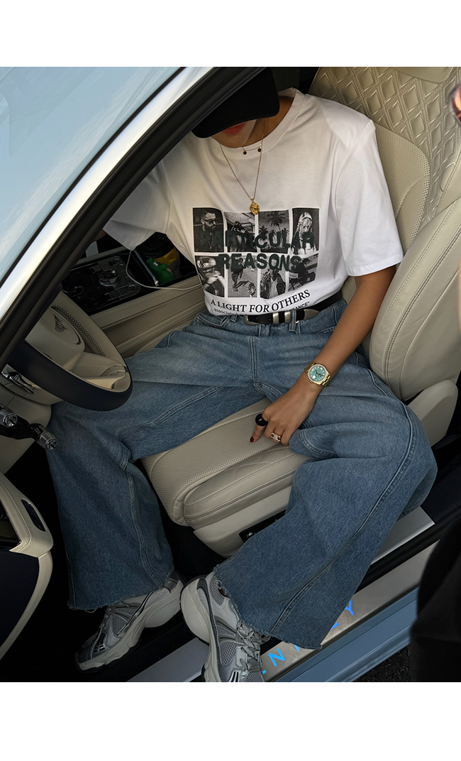 다양한 무드로 즐길 수 있는 활용도 높은 티셔츠예요.