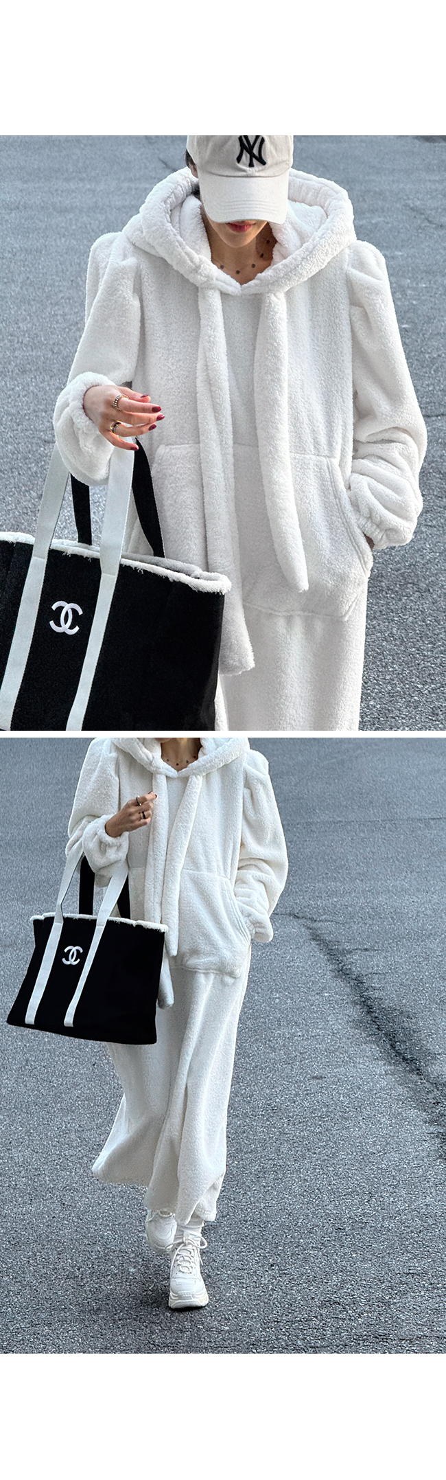 볼륨감 있는 후드에는 자연스럽게 떨어지는 스트랩이 더해져