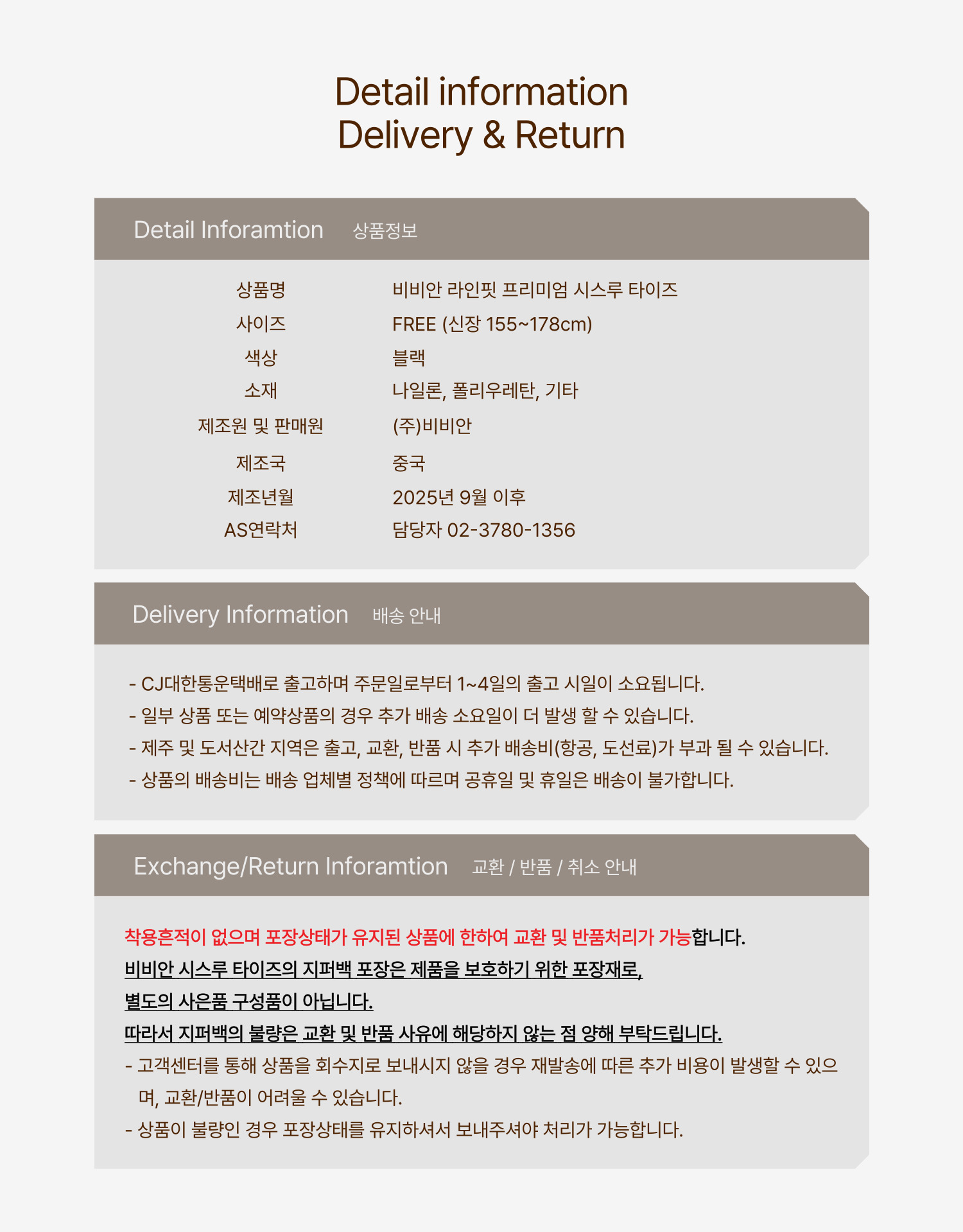 - - 고객님의 단순 변심(색상,사이즈 등)에 의한 교환/반품은 왕복 배송비 6,000원을 고객님께서 부담하셔야 합니다.