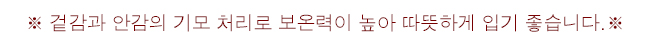 겉감까지 기모가 들어가 포근한 보온성을 주면서도