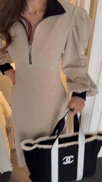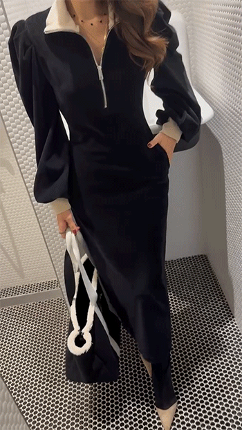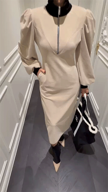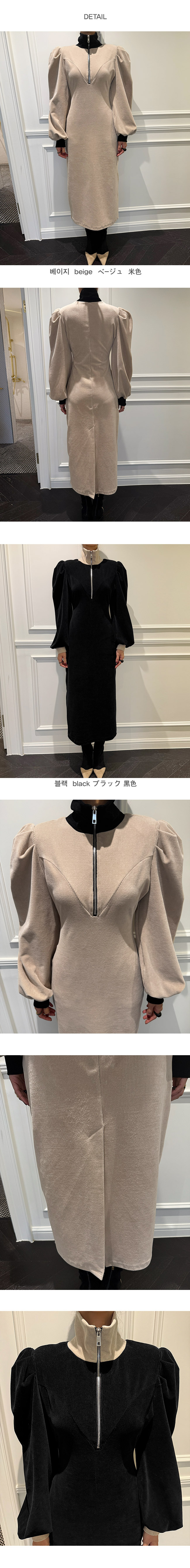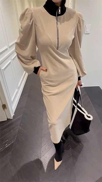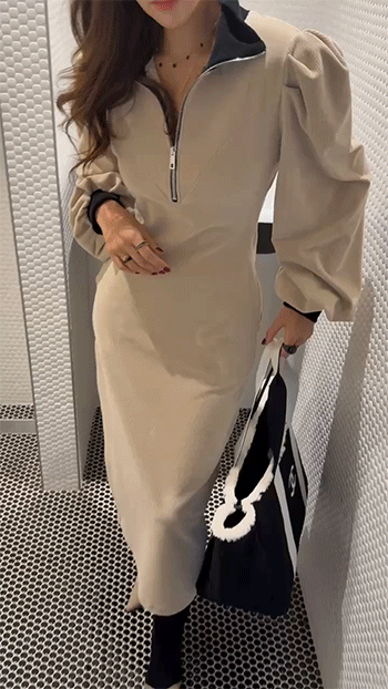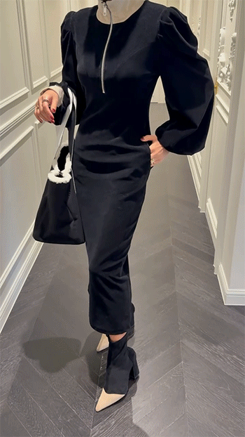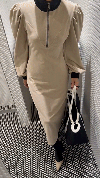 볼륨감 있는 퍼프 소매와 슬림하게 떨어지는 H라인 실루엣이