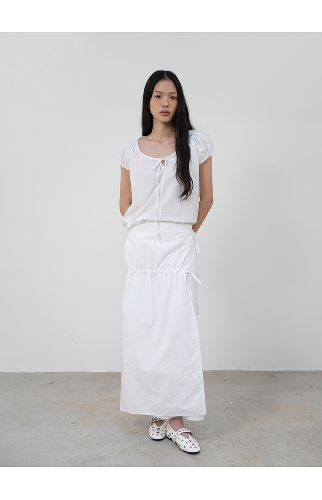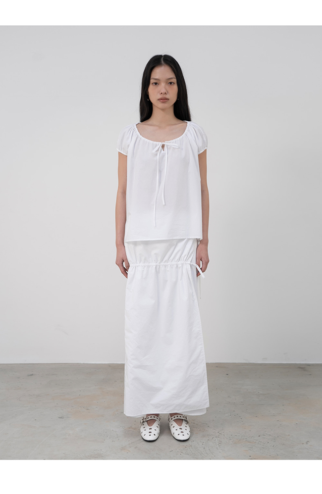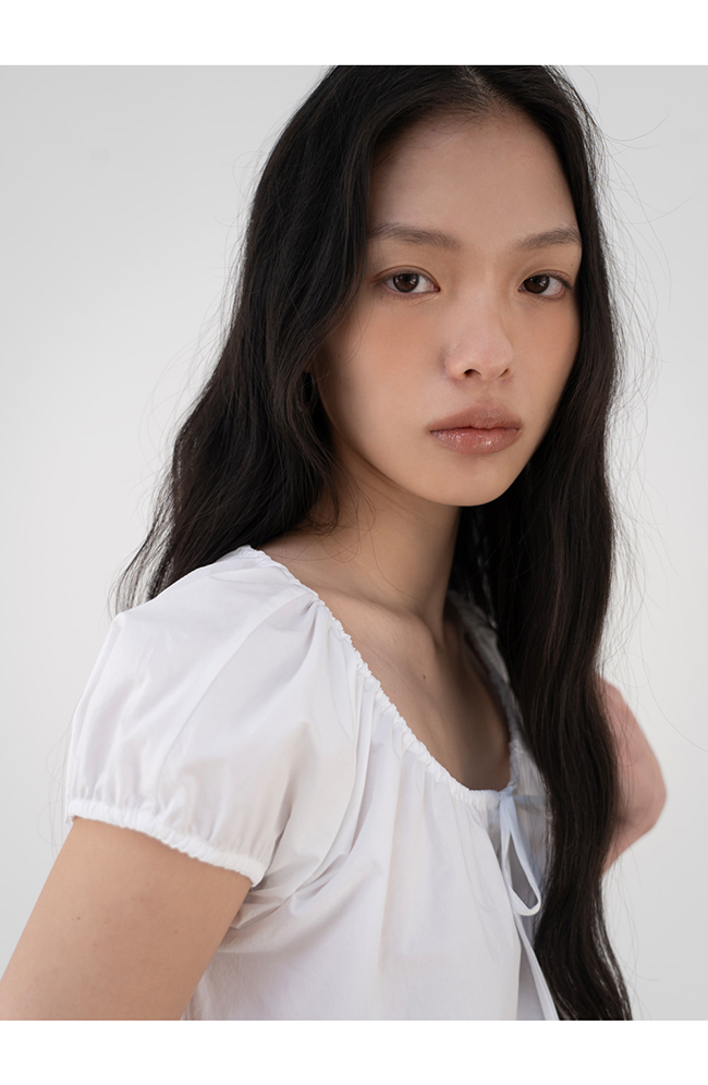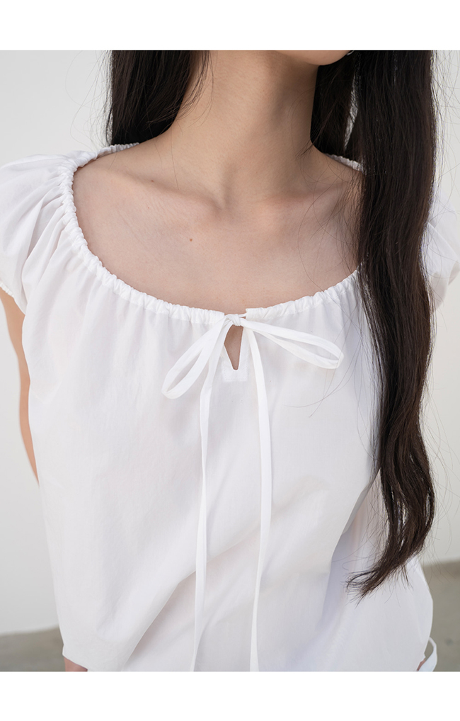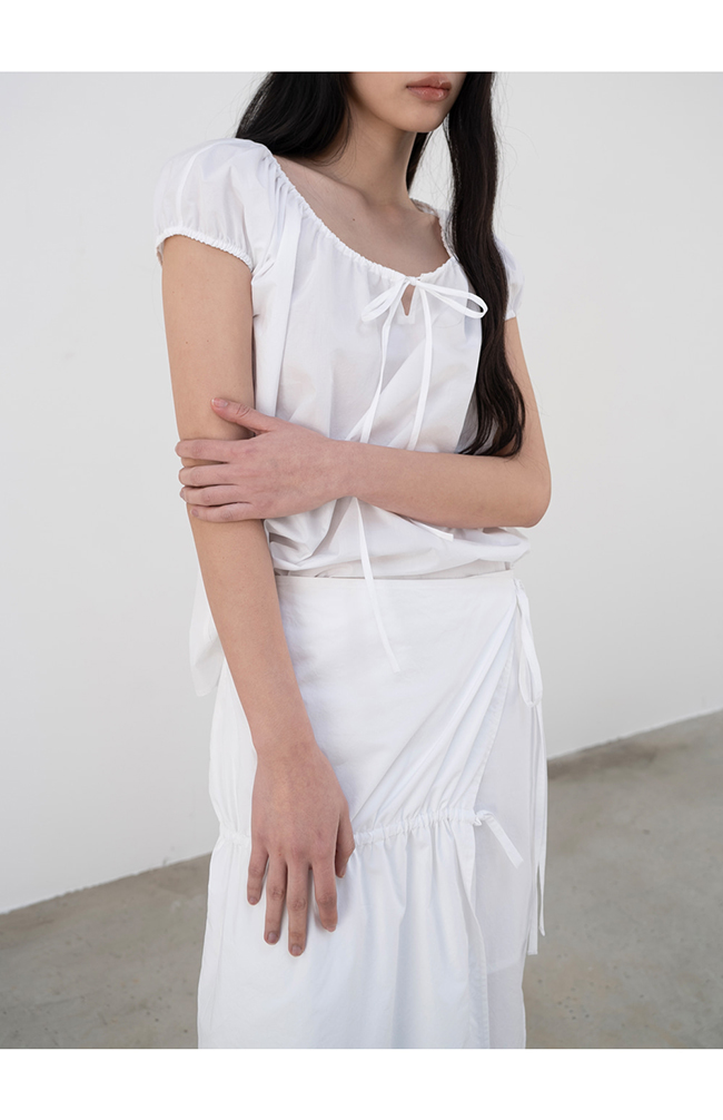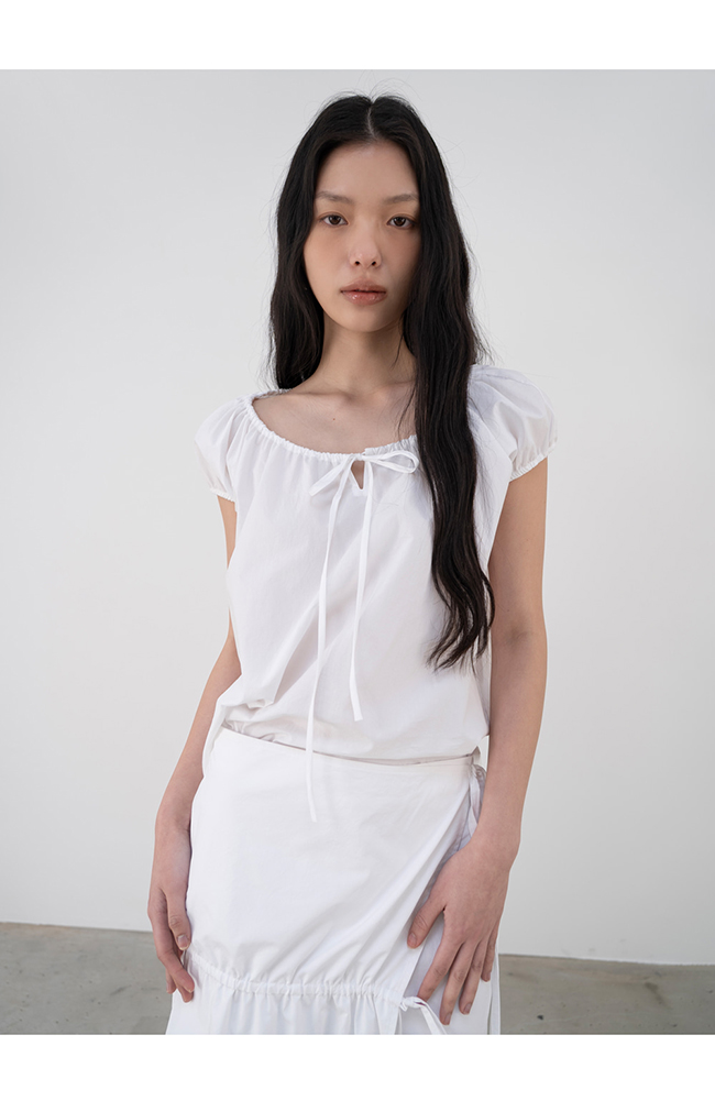 네크라인에 있는 리본을 묶어 러블리한 무드로 연출하거나 스트링을