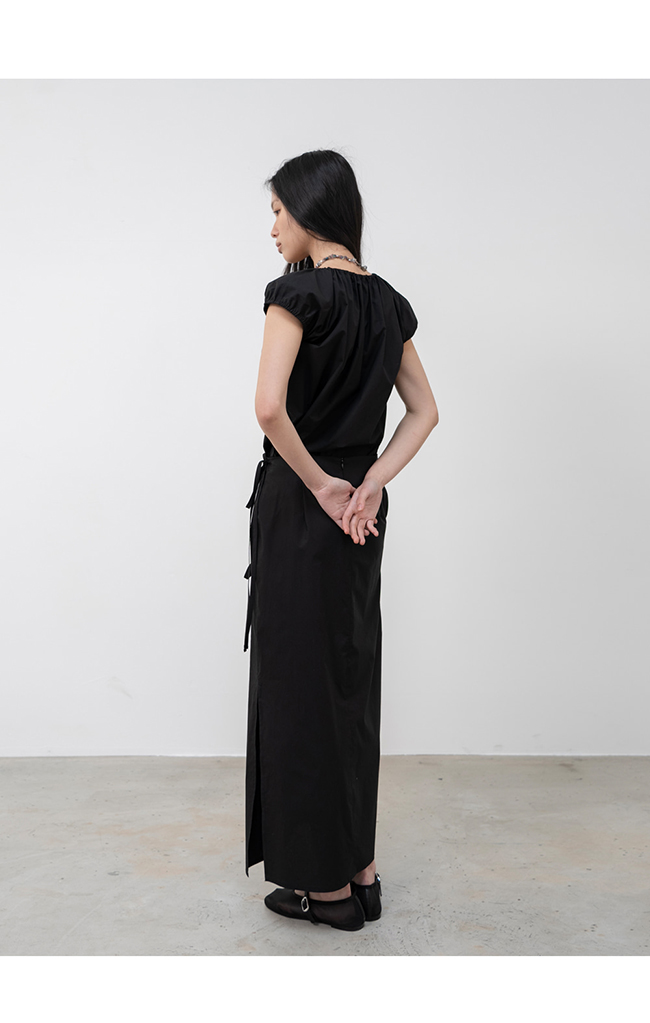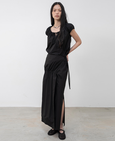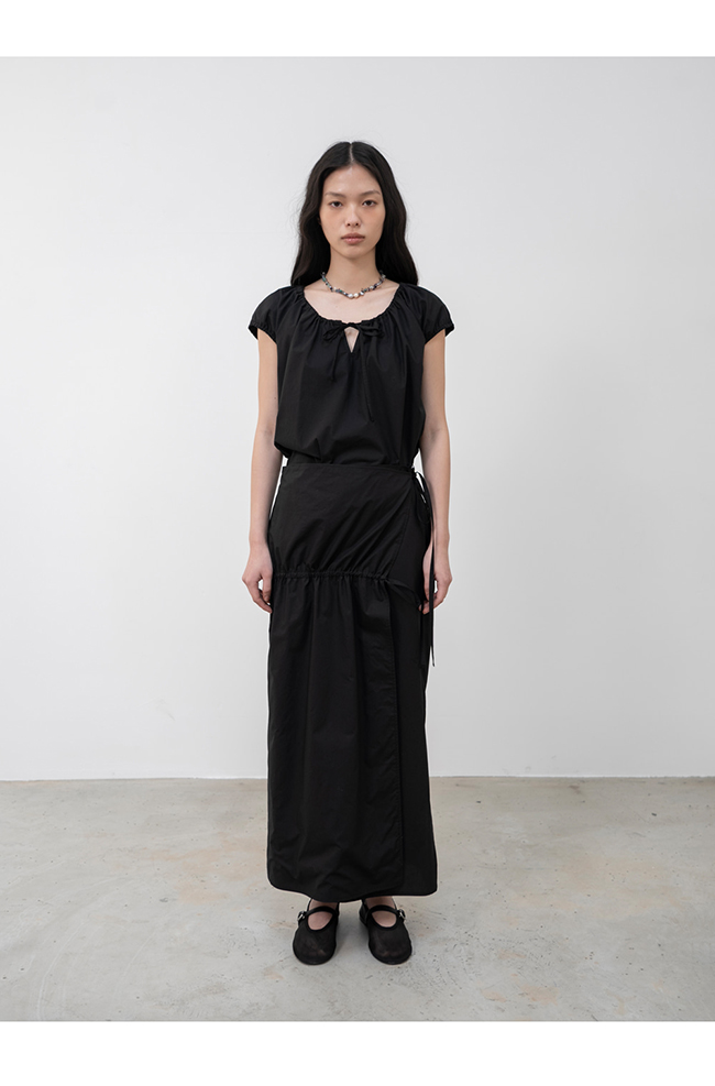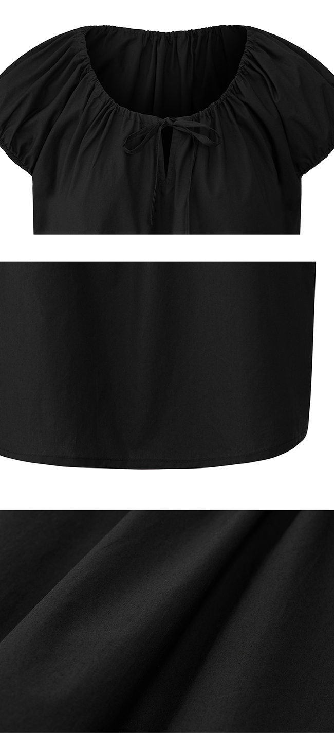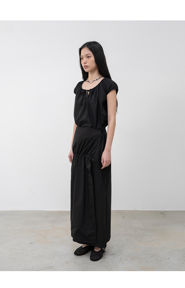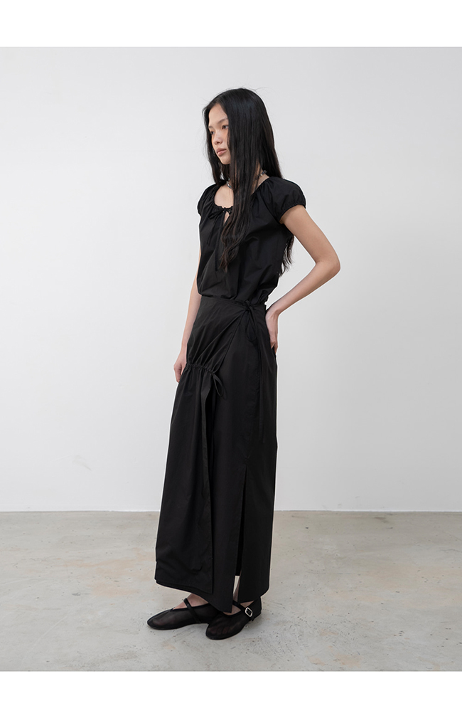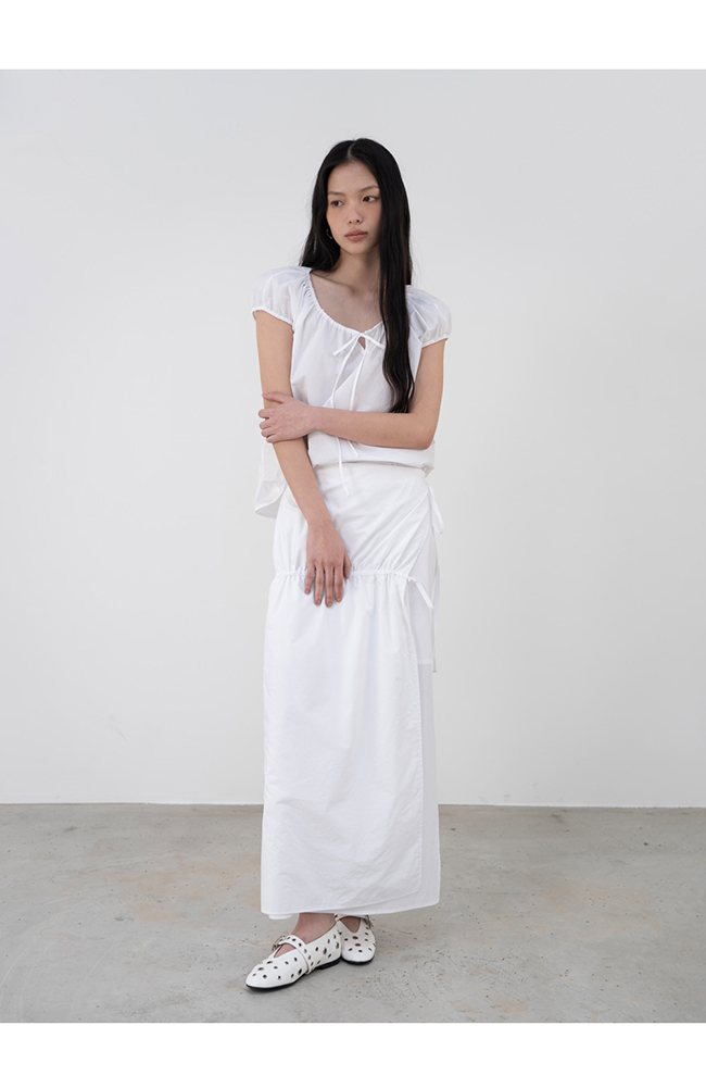 네크라인에 있는 리본을 묶어 러블리한 무드로 연출하거나 스트링을