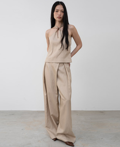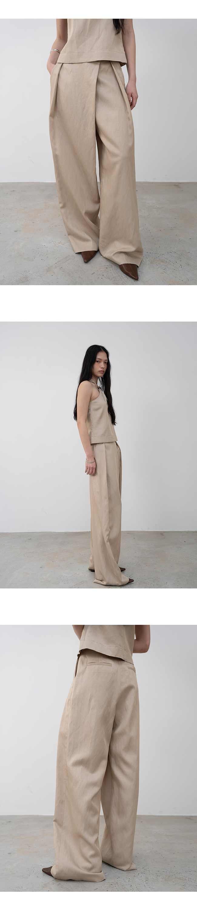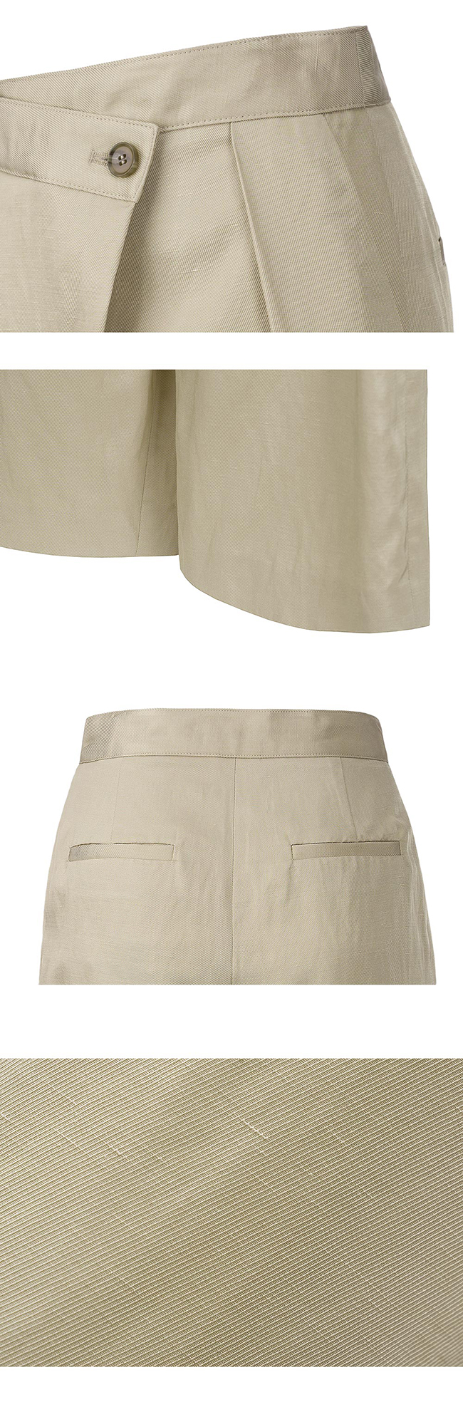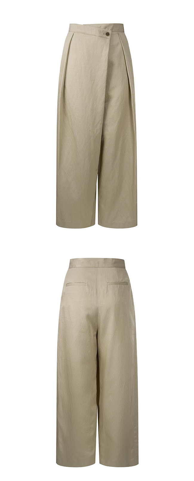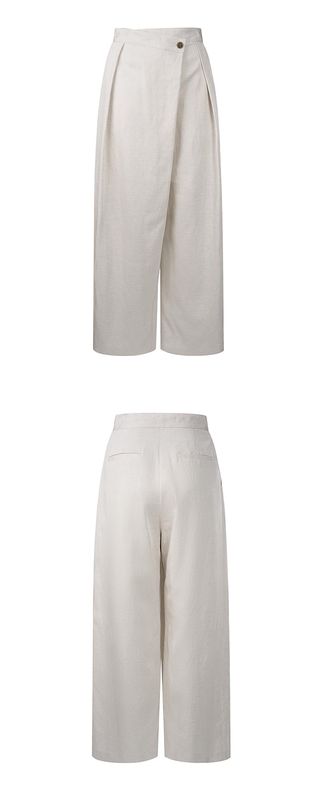 은은한 광이 느껴지는 비스코스 레이온, 린넨 혼방 소재의 랩 팬츠입니다.