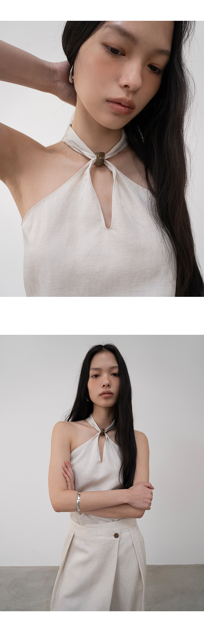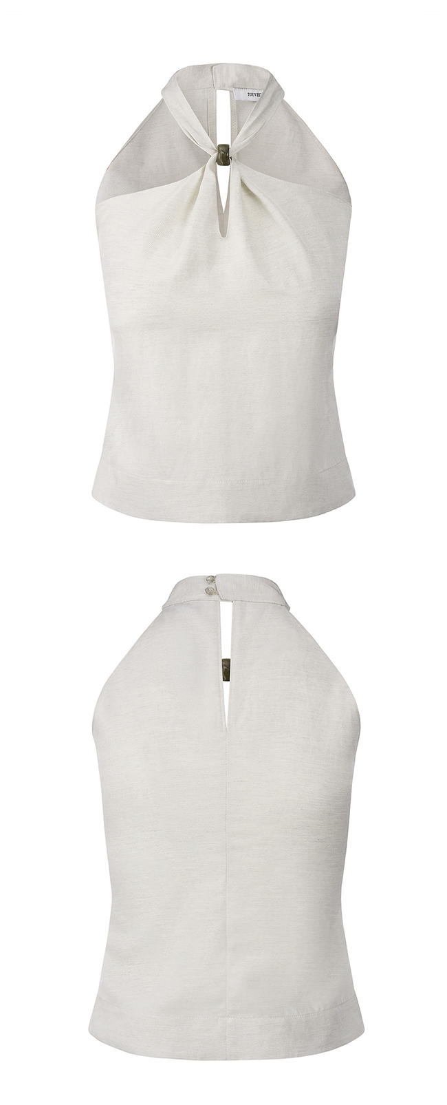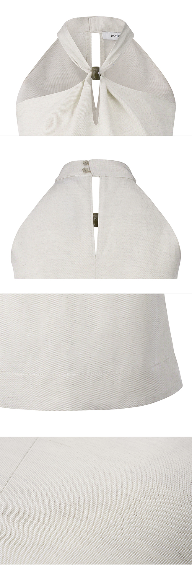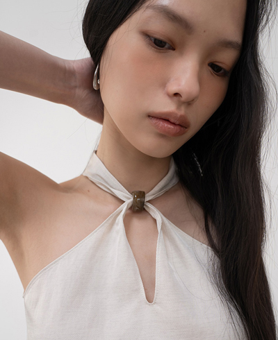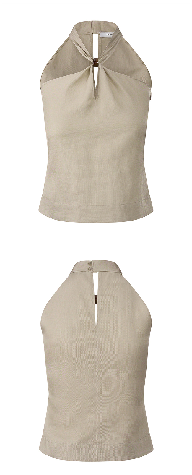 은은한 광이 느껴지는 비스코스 레이온, 린넨 혼방 소재의 홀터넥 탑입니다.