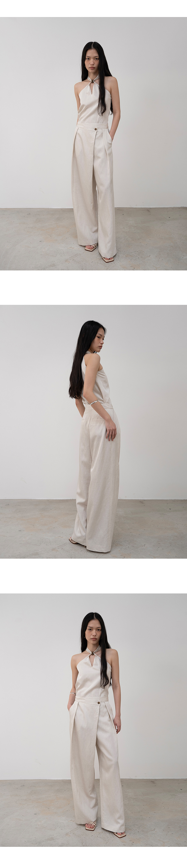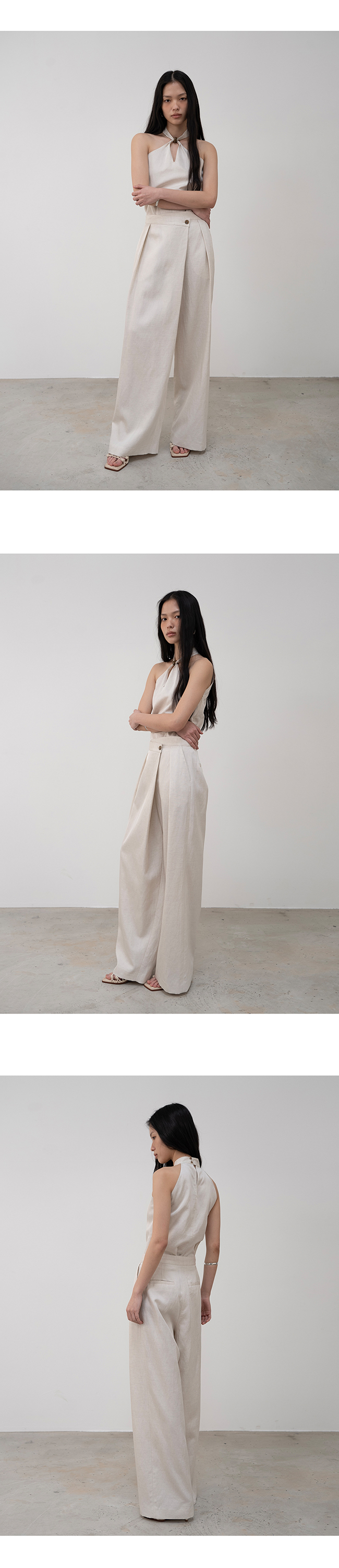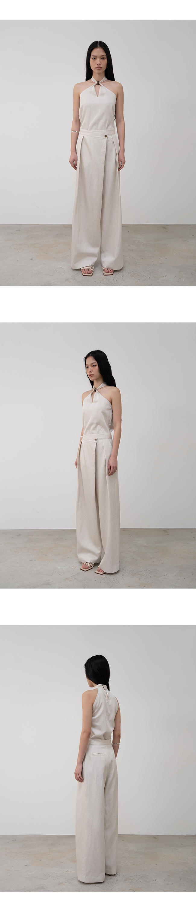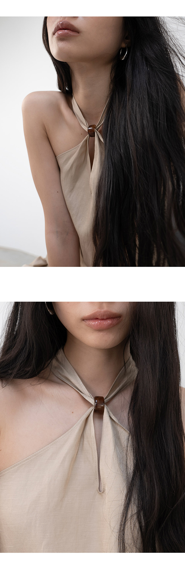 은은한 광이 느껴지는 비스코스 레이온, 린넨 혼방 소재의 홀터넥 탑입니다.