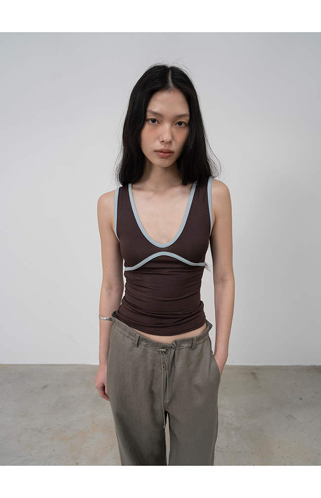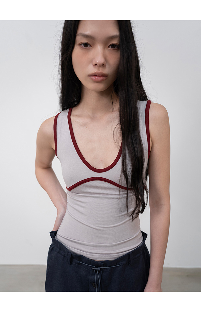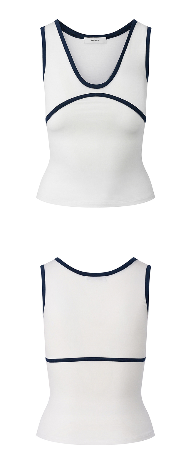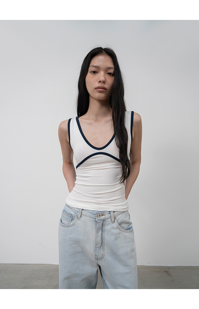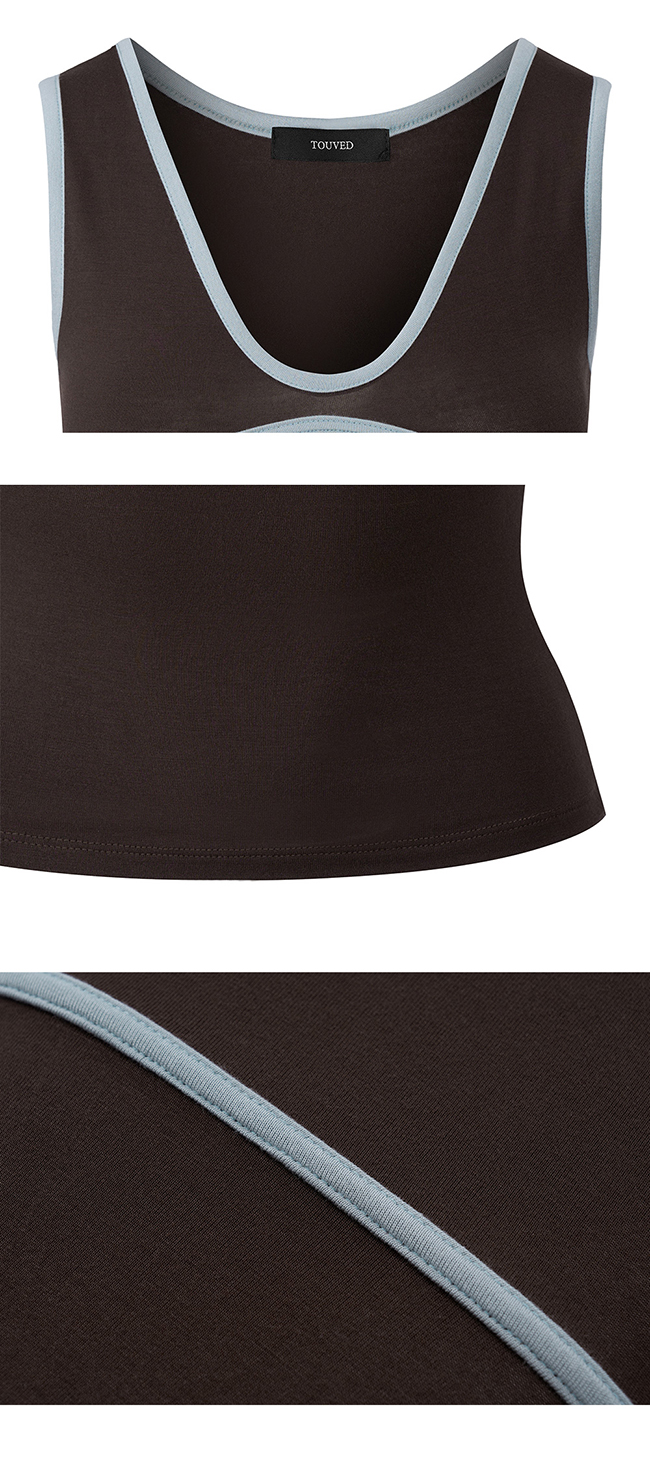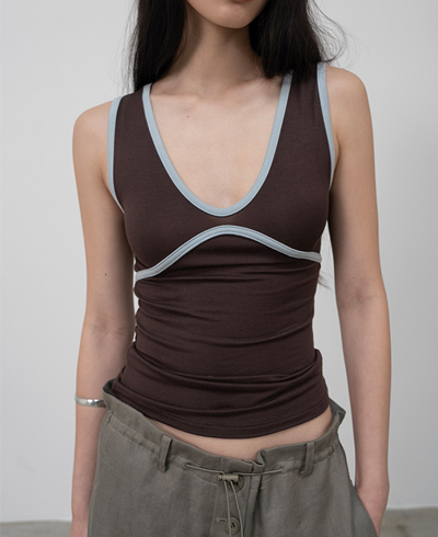 깊게 파인 넥 라인과 가슴 배색 바인딩 포인트가 특징인 슬리브리스 탑입니다.