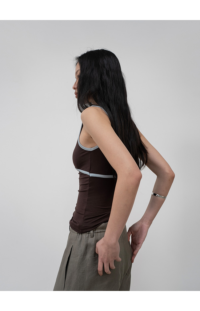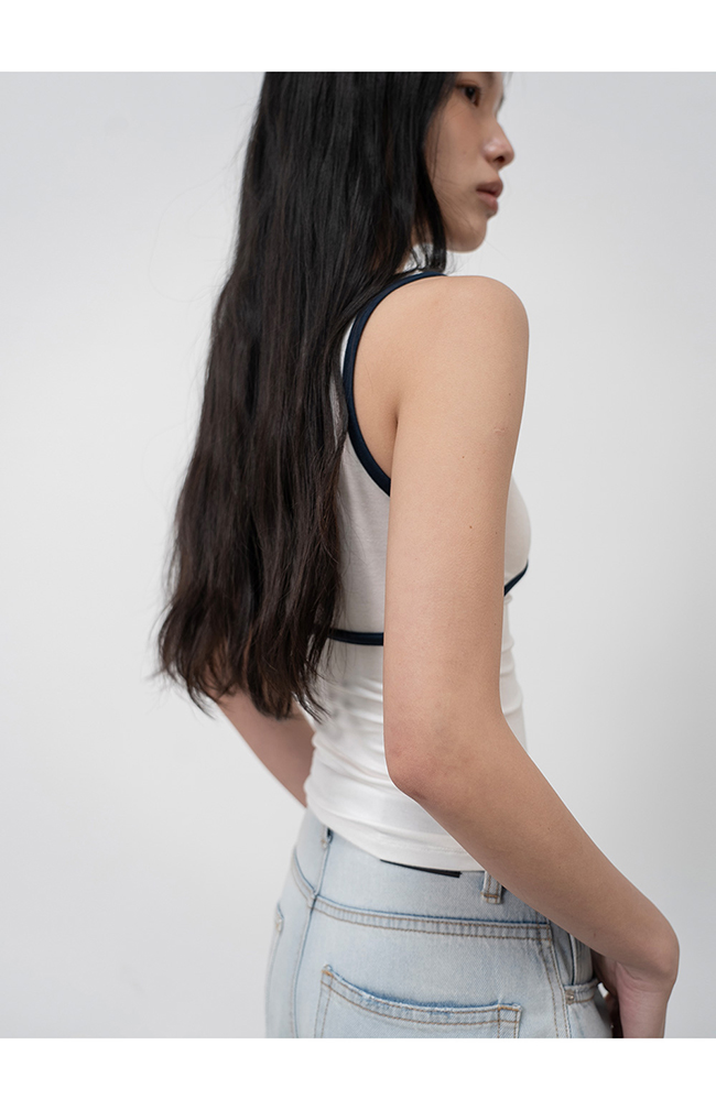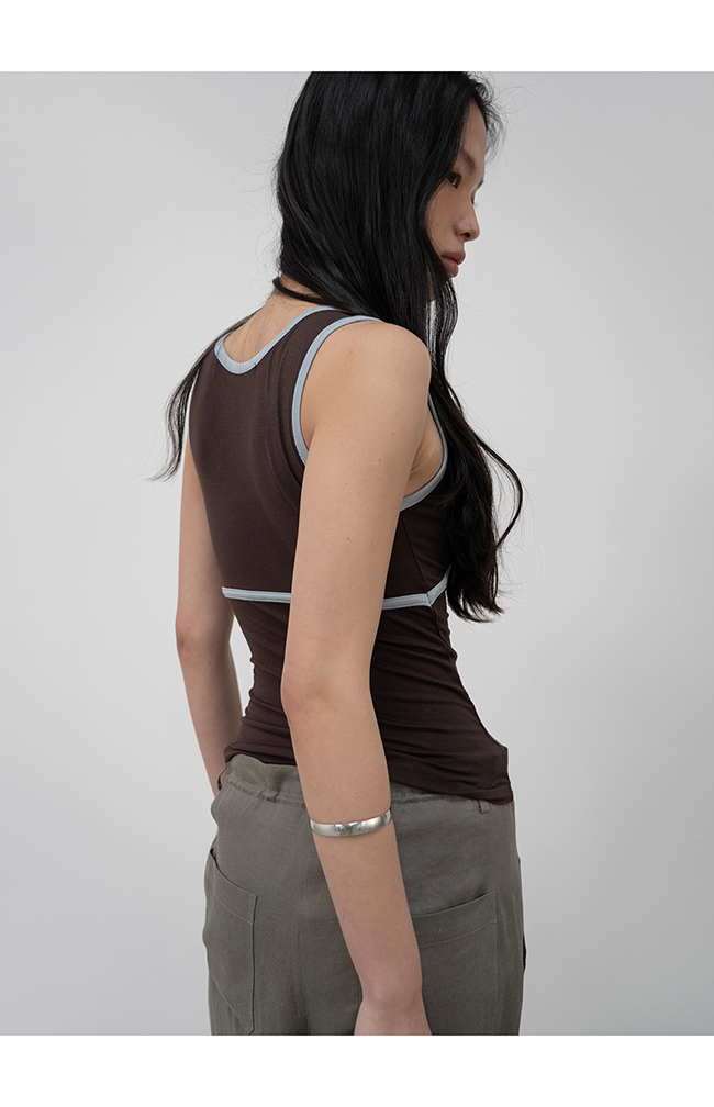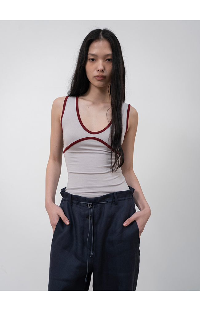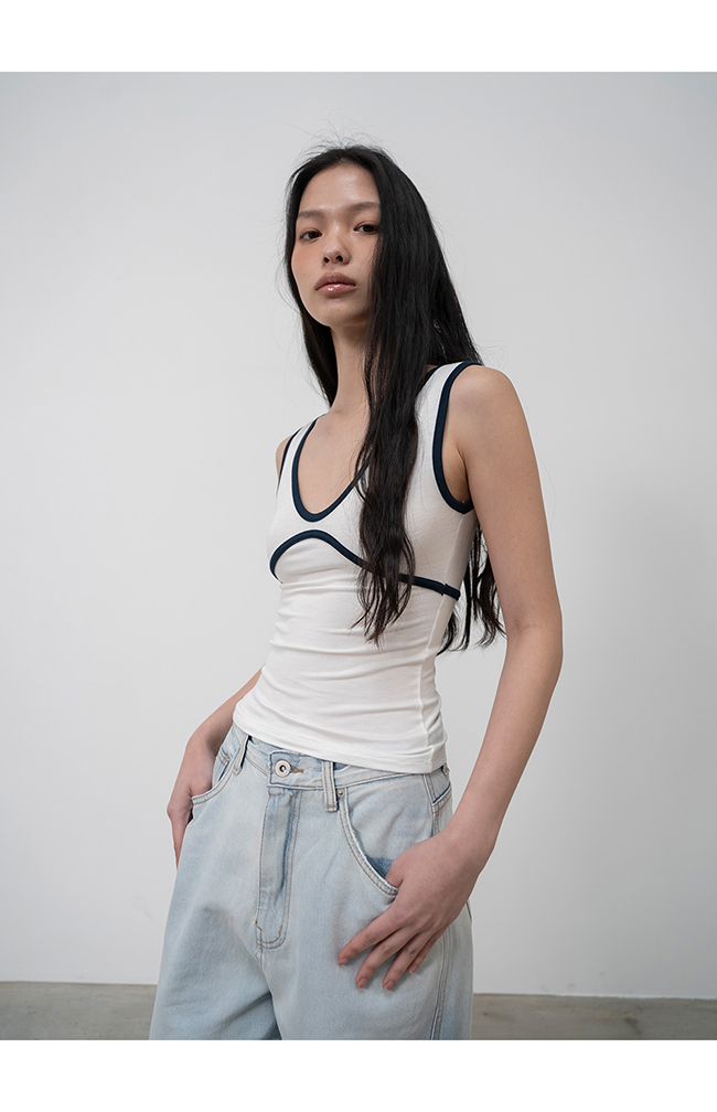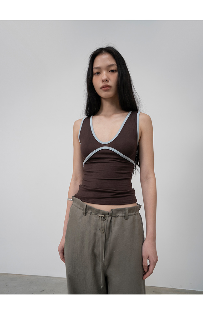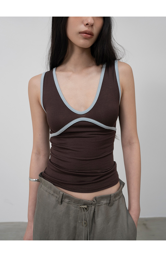 깊게 파인 넥 라인과 가슴 배색 바인딩 포인트가 특징인 슬리브리스 탑입니다.