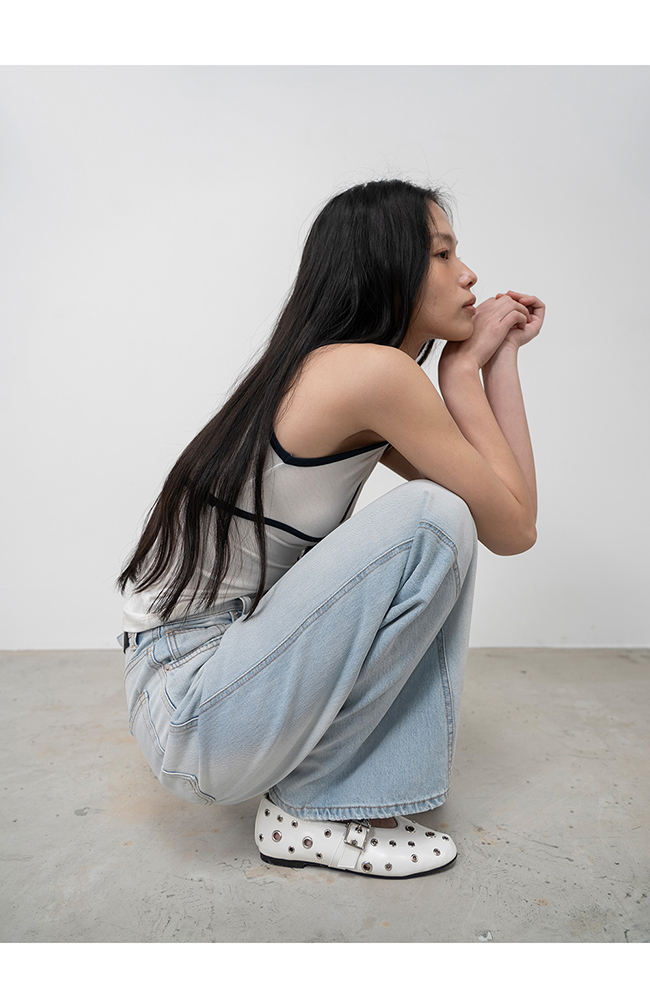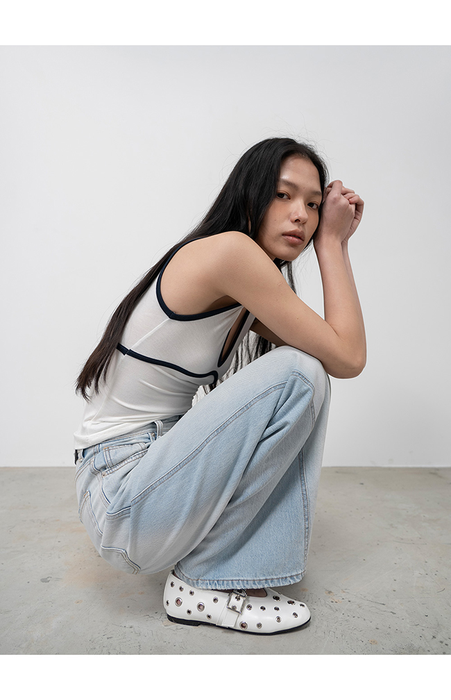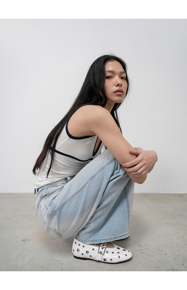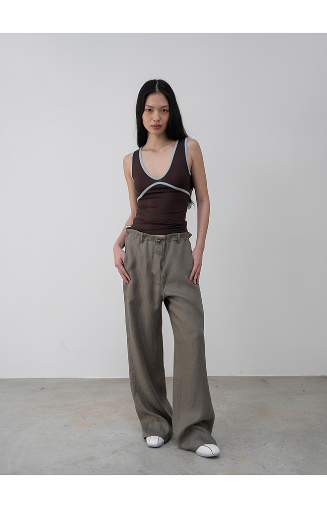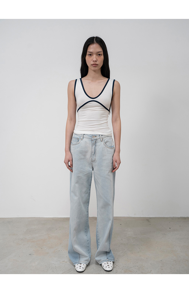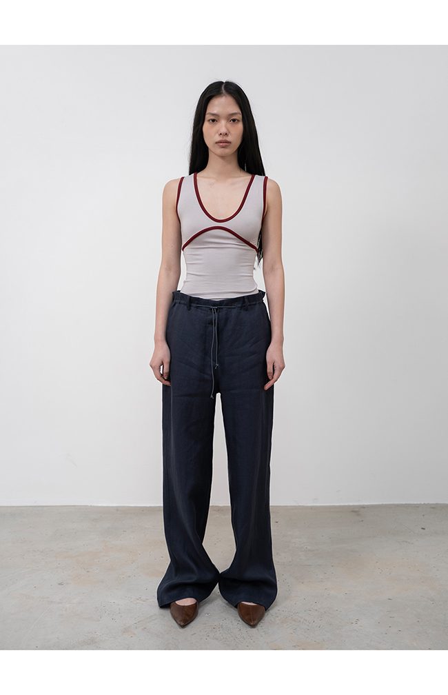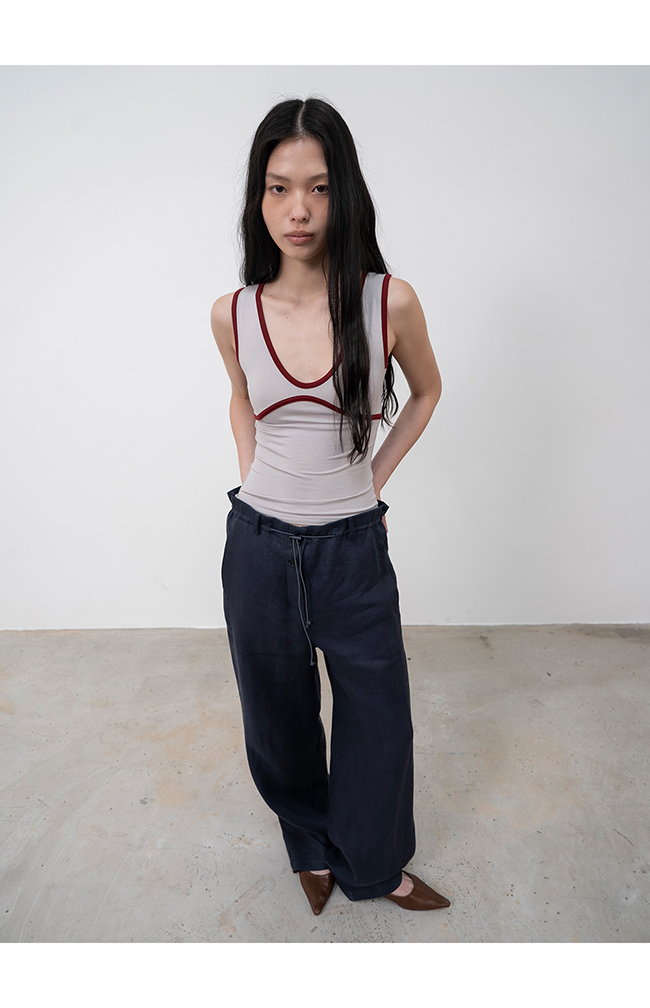 깊게 파인 넥 라인과 가슴 배색 바인딩 포인트가 특징인 슬리브리스 탑입니다.