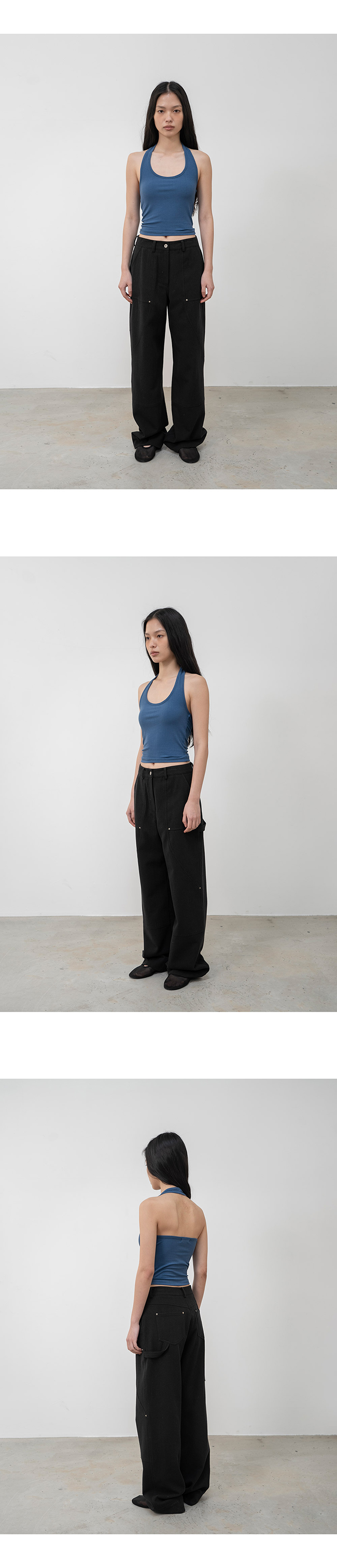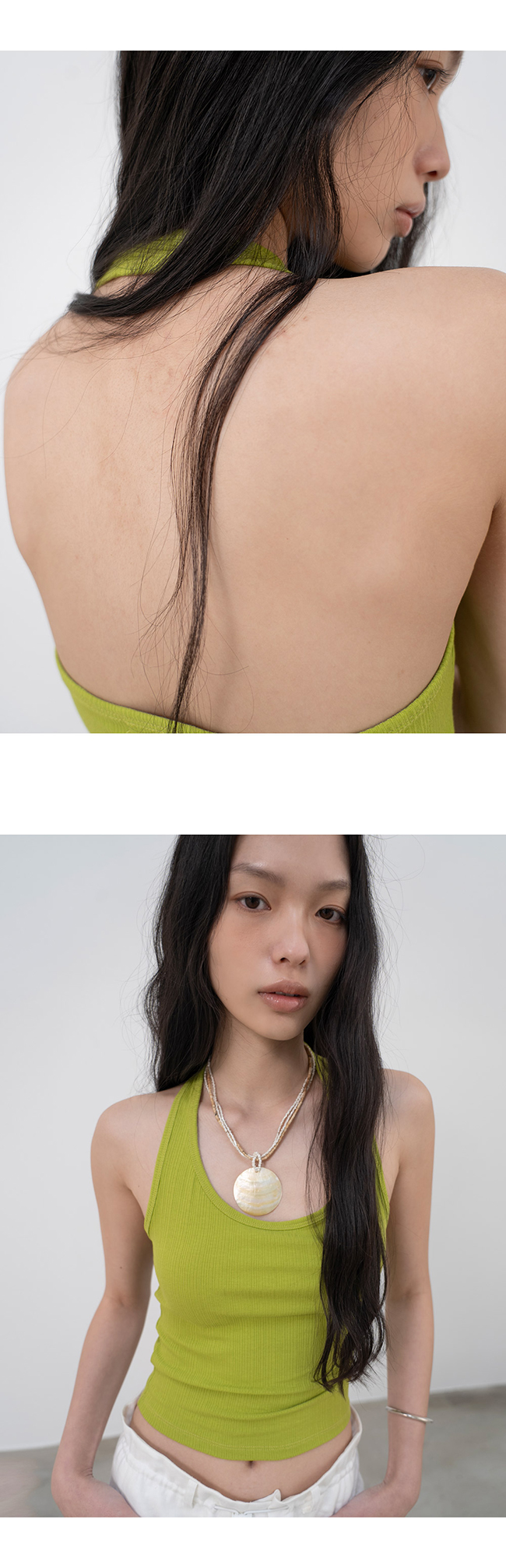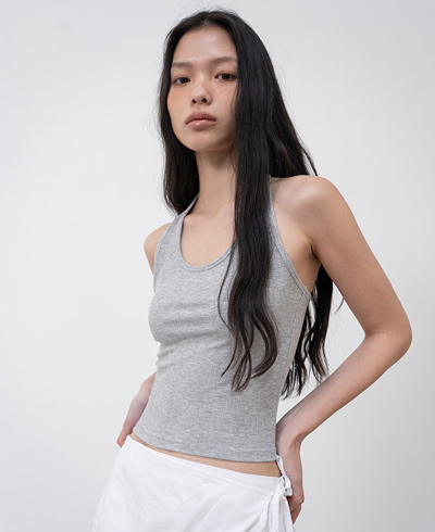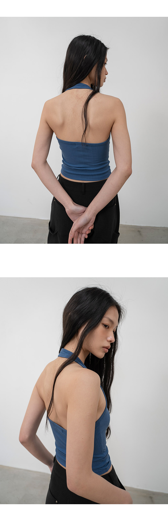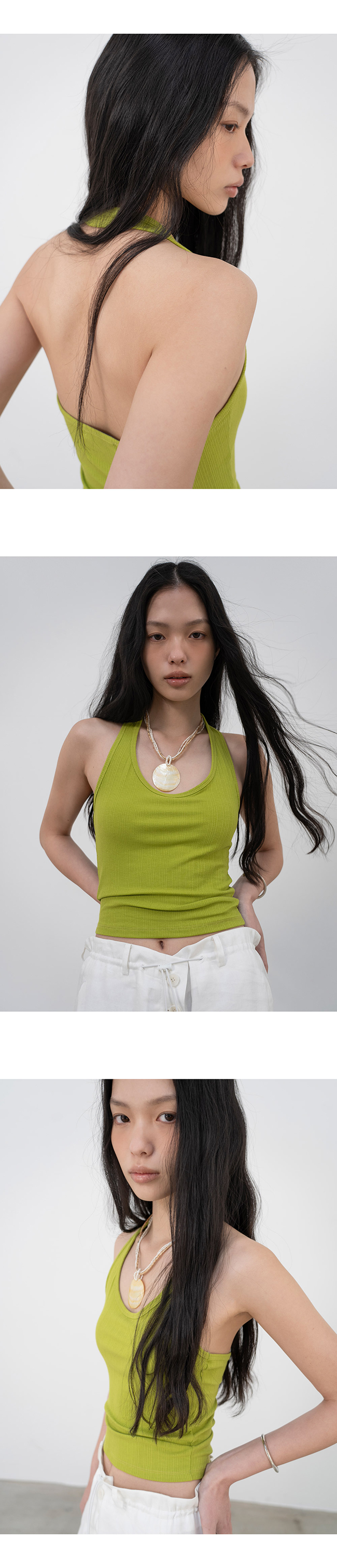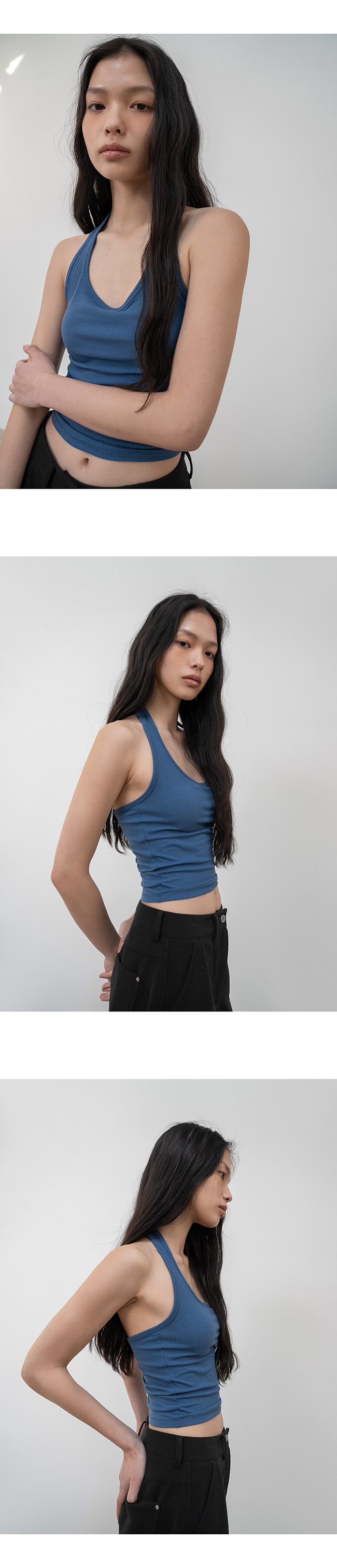 홀터넥과 백리스 디자인의 슬리브리스 탑입니다.