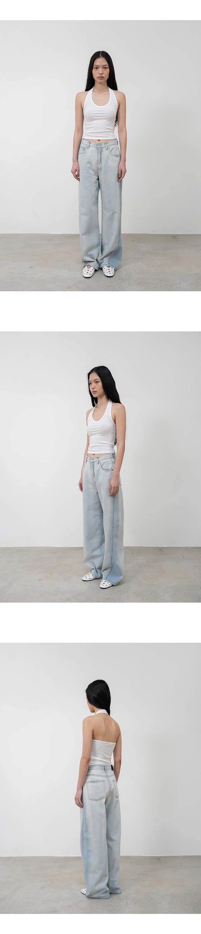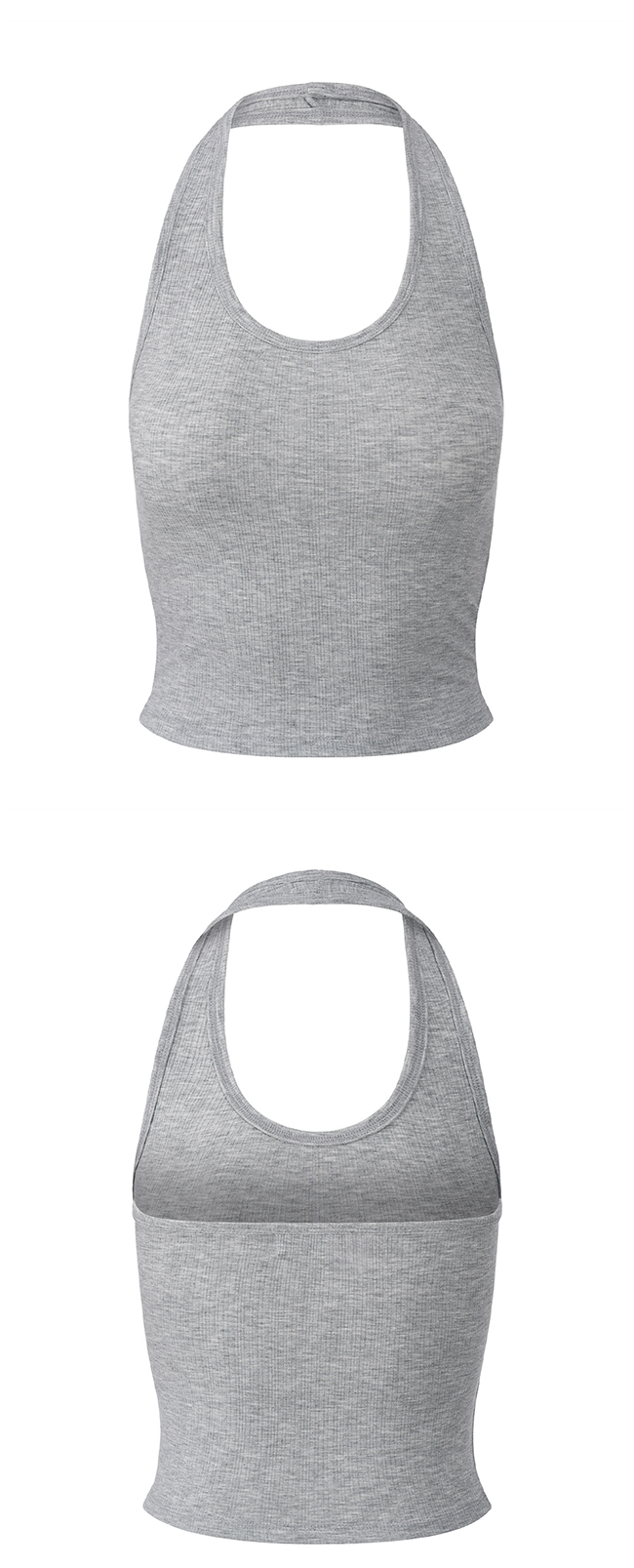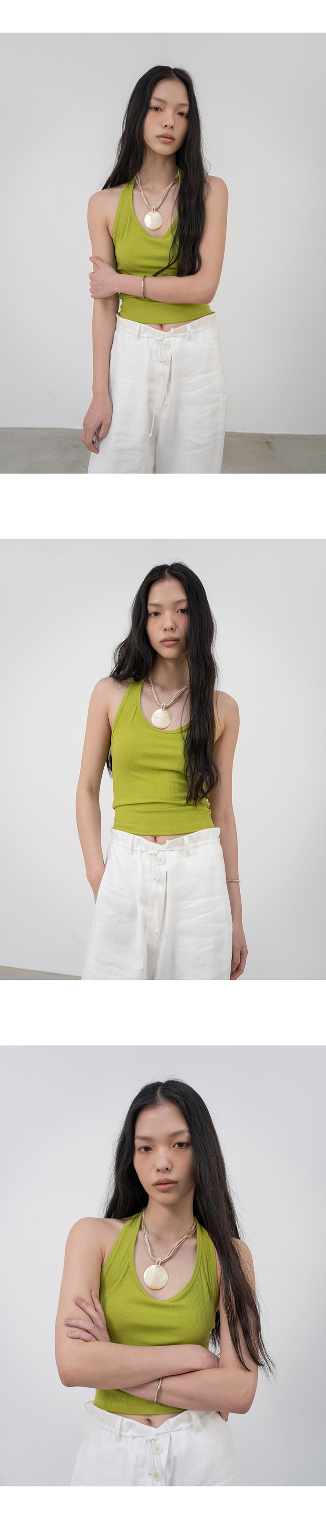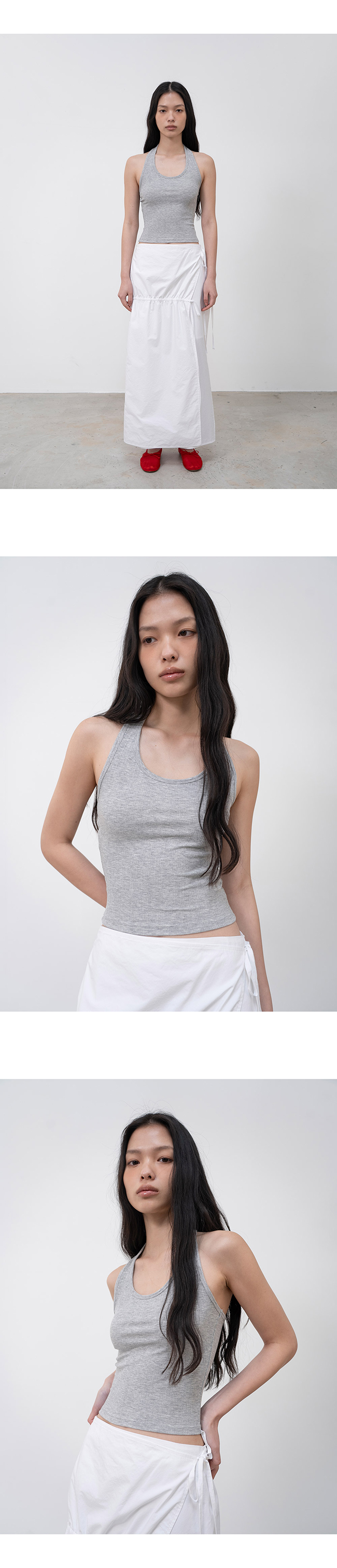 홀터넥과 백리스 디자인의 슬리브리스 탑입니다.