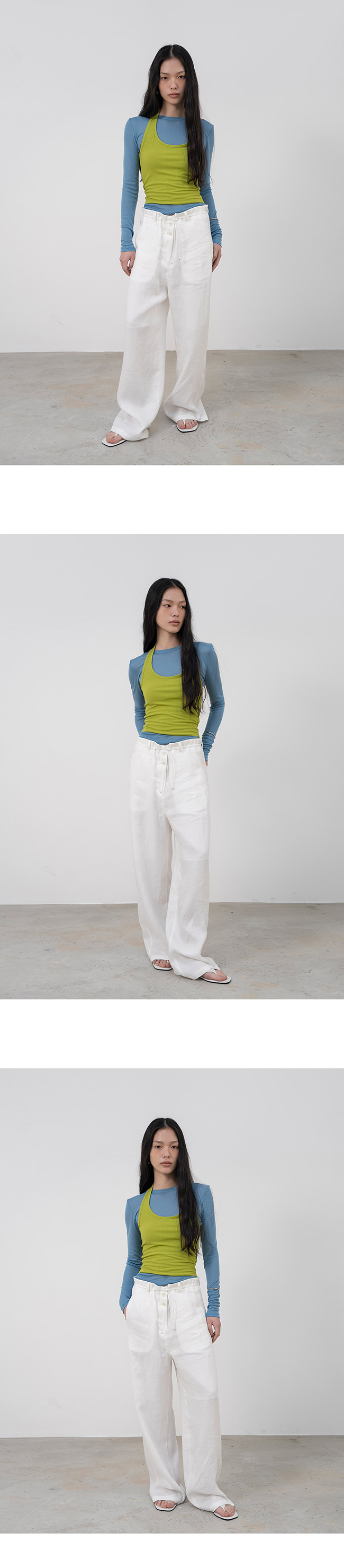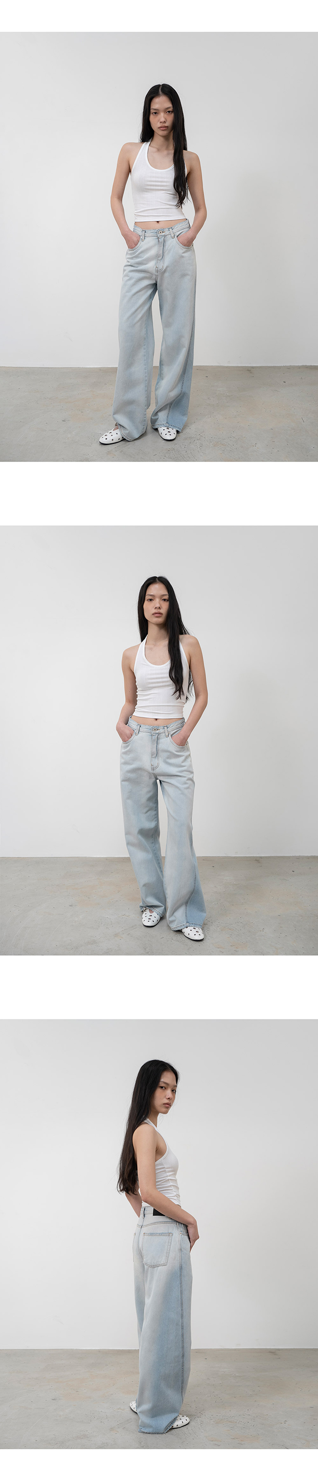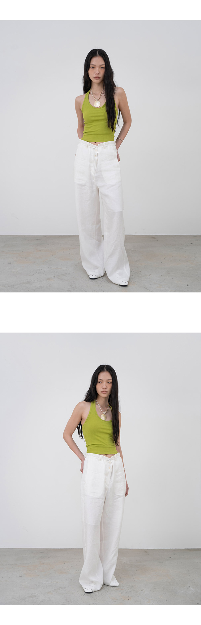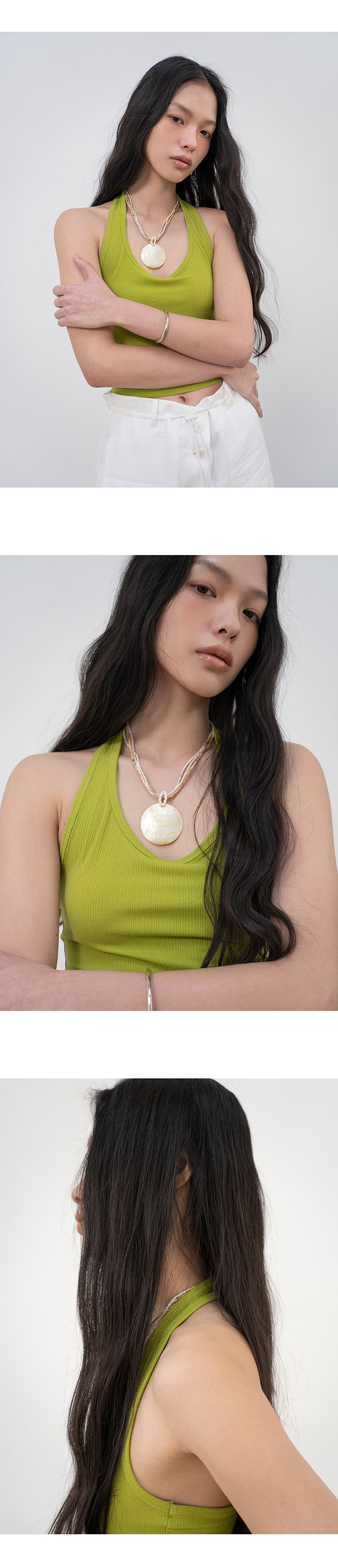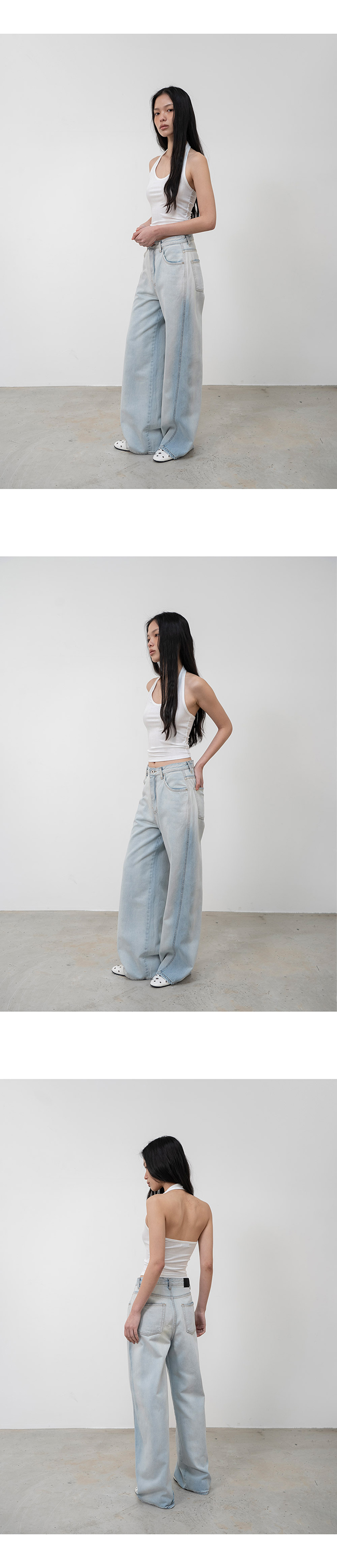 홀터넥과 백리스 디자인의 슬리브리스 탑입니다.