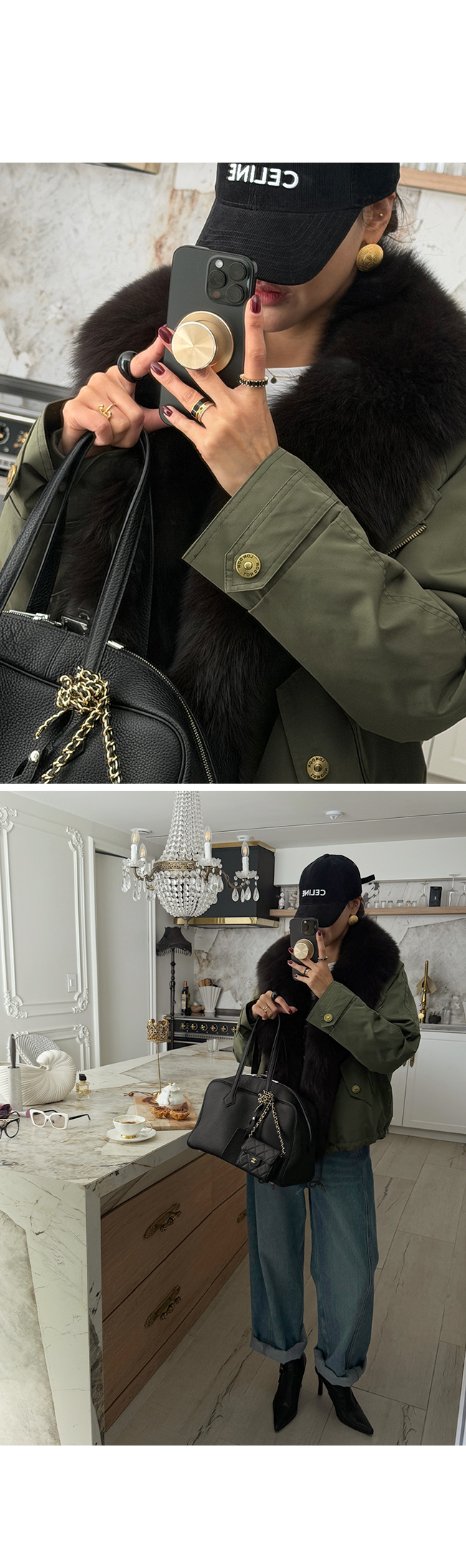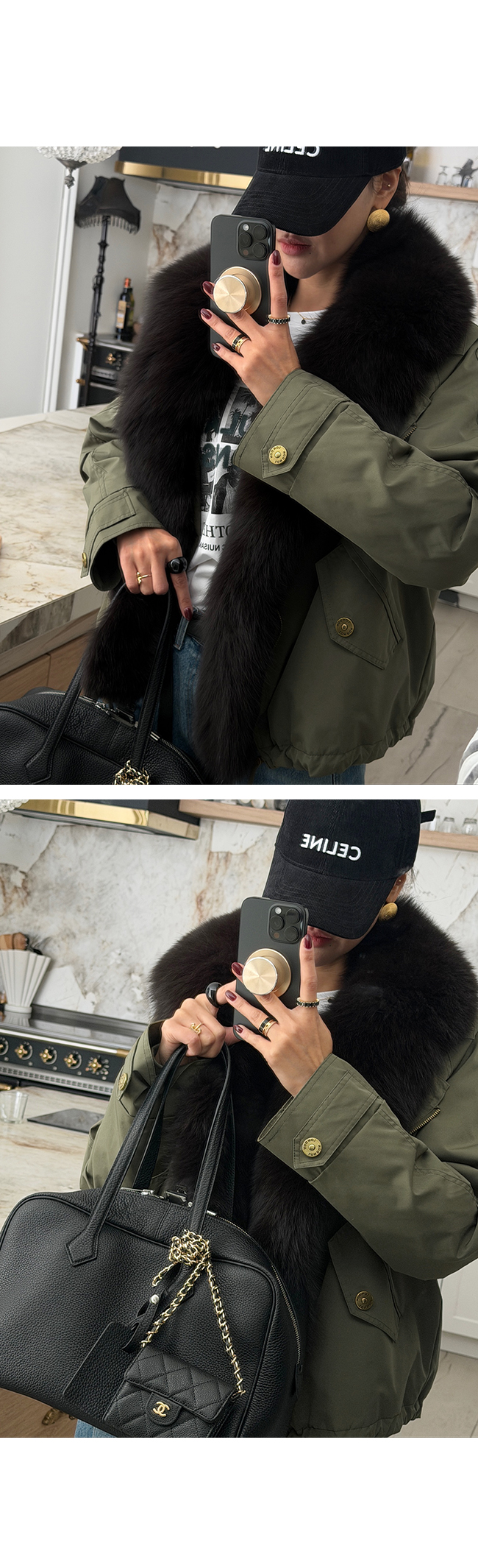 겉감,안감 - 폴리(polyester/涤纶) 100% / 충전재 - 오리 솜털(duck downy hair/鸭子 绒毛) 90%+깃털(feather/羽毛) 10% / 카라퍼 - 폭스털(fox feather/狐狸毛)