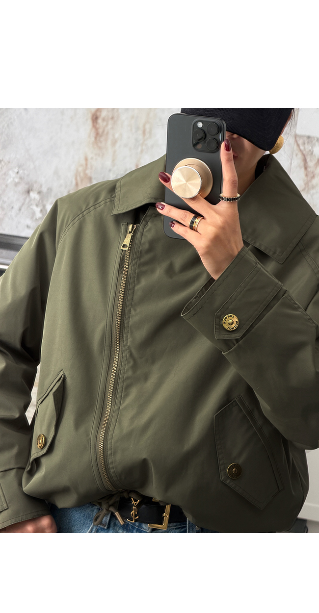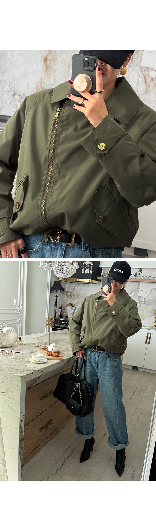 골드 톤의 스냅 버튼과 지퍼 디테일이