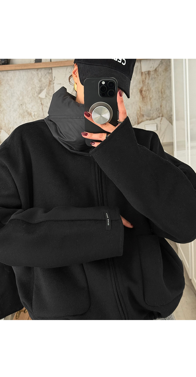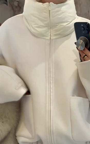 넥 라인은 패딩 배색 하이넥 디자인으로