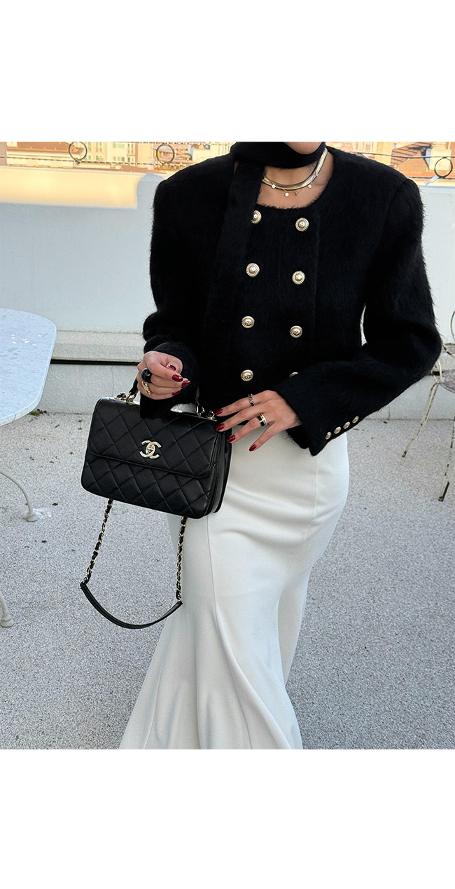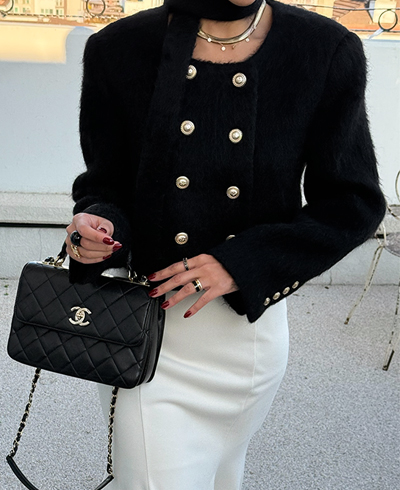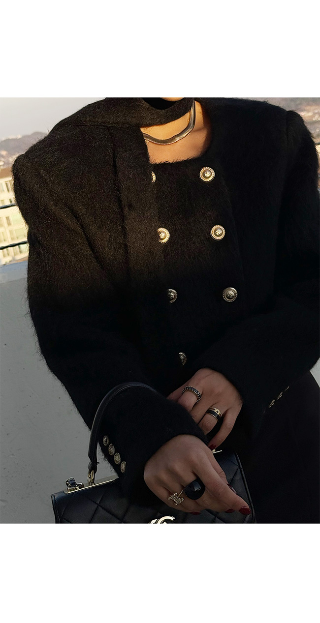 금장 더블 버튼이 룩의 포인트를 확실히 잡아주며,