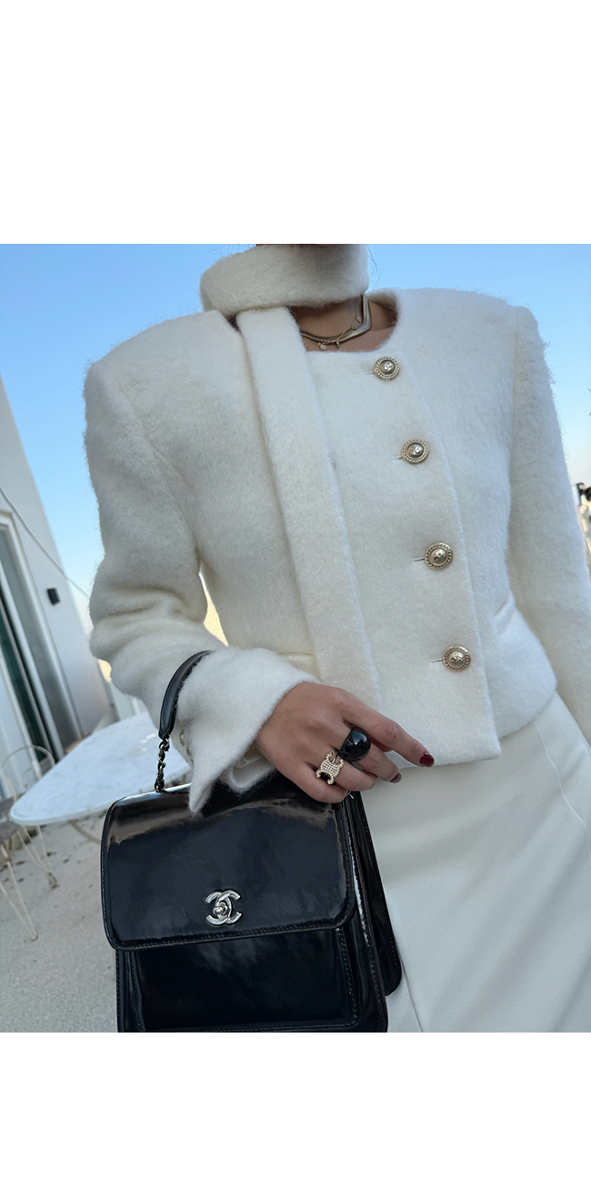 소매 끝까지 더해진 금장 버튼 포인트 역시