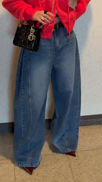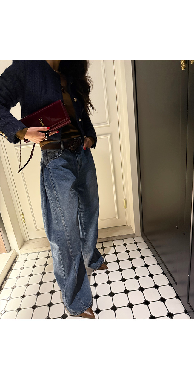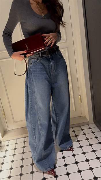 허벅지부터 여유 있게 떨어지는 와이드 실루엣으로