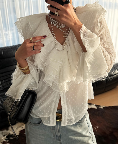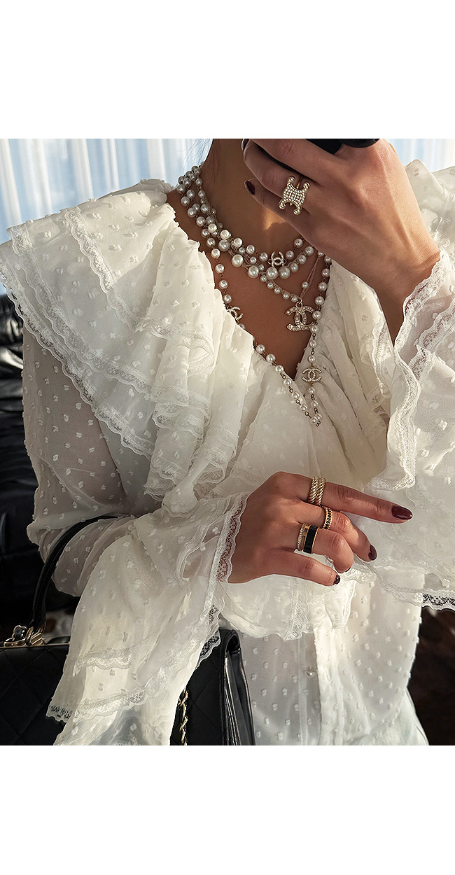넥 라인을 따라 풍성하게 흐르는 레이어드 프릴 디테일이