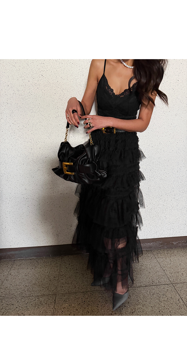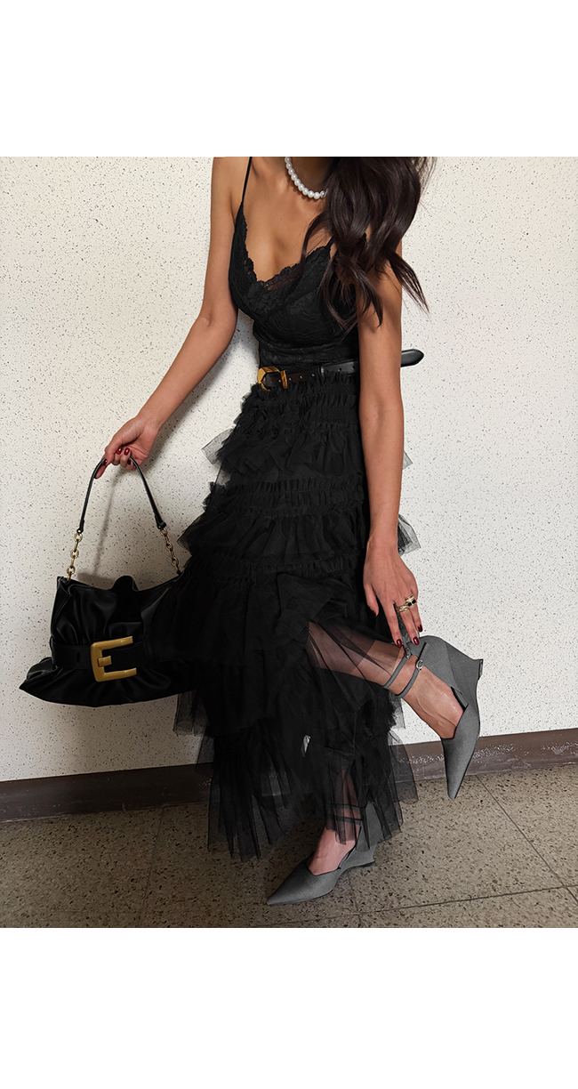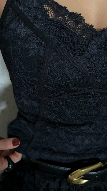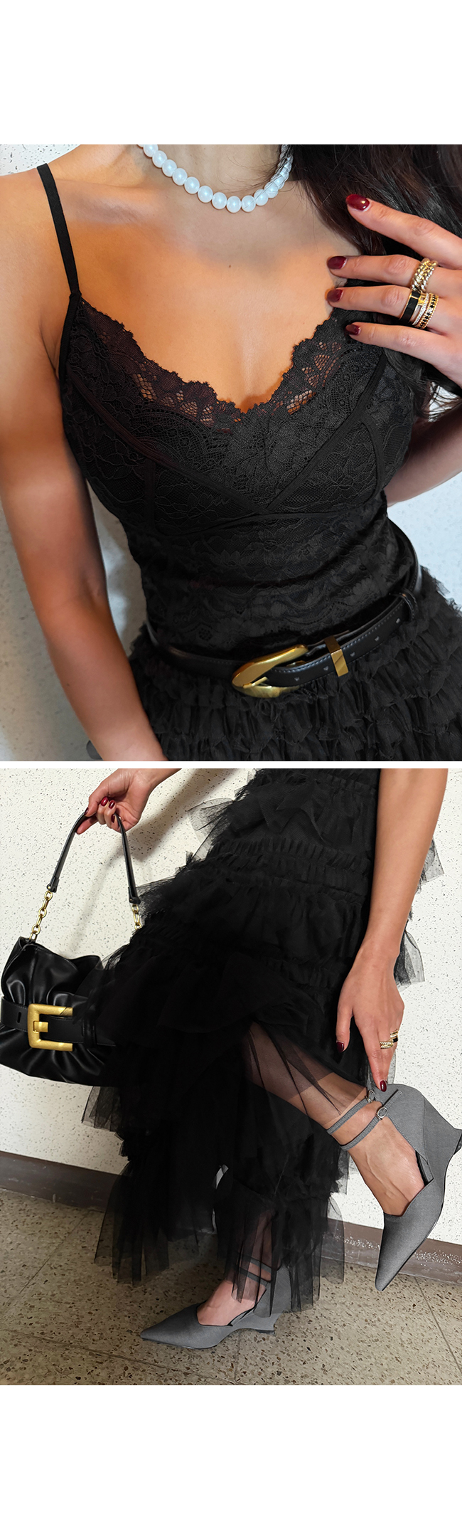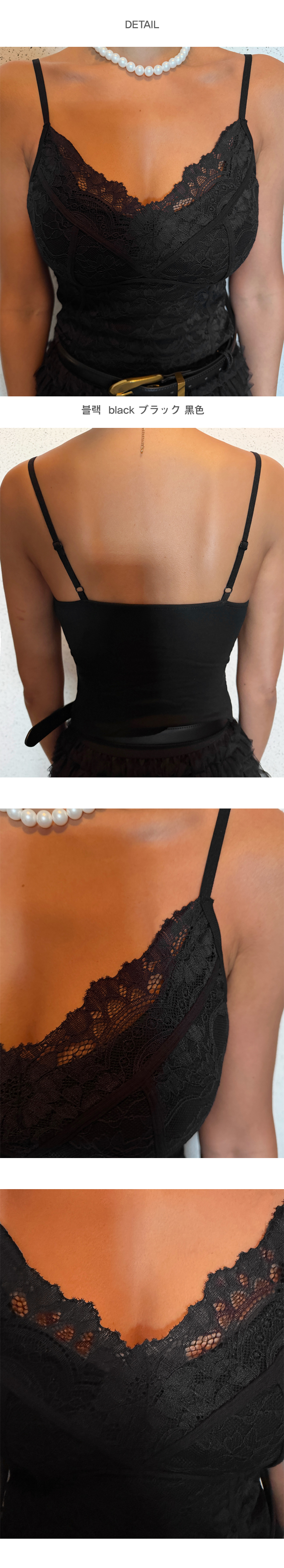 레이스 트리밍이 쇄골과 바디 라인을 여성스럽게 강조해주며,