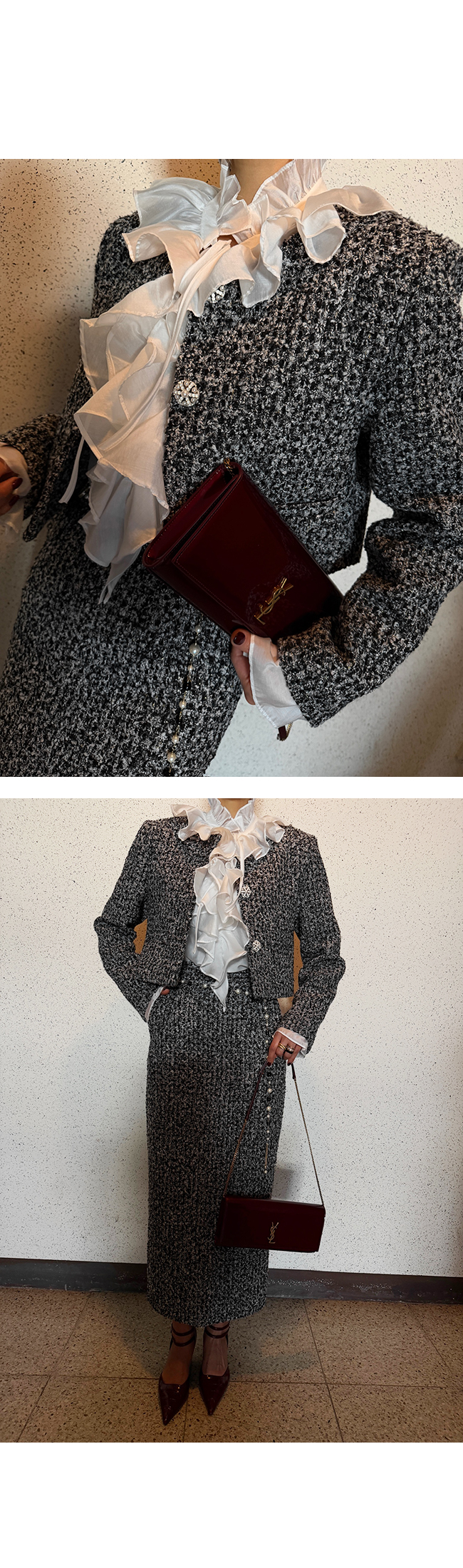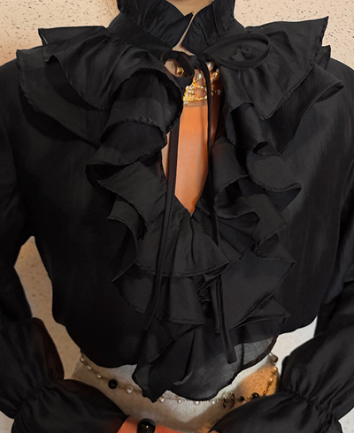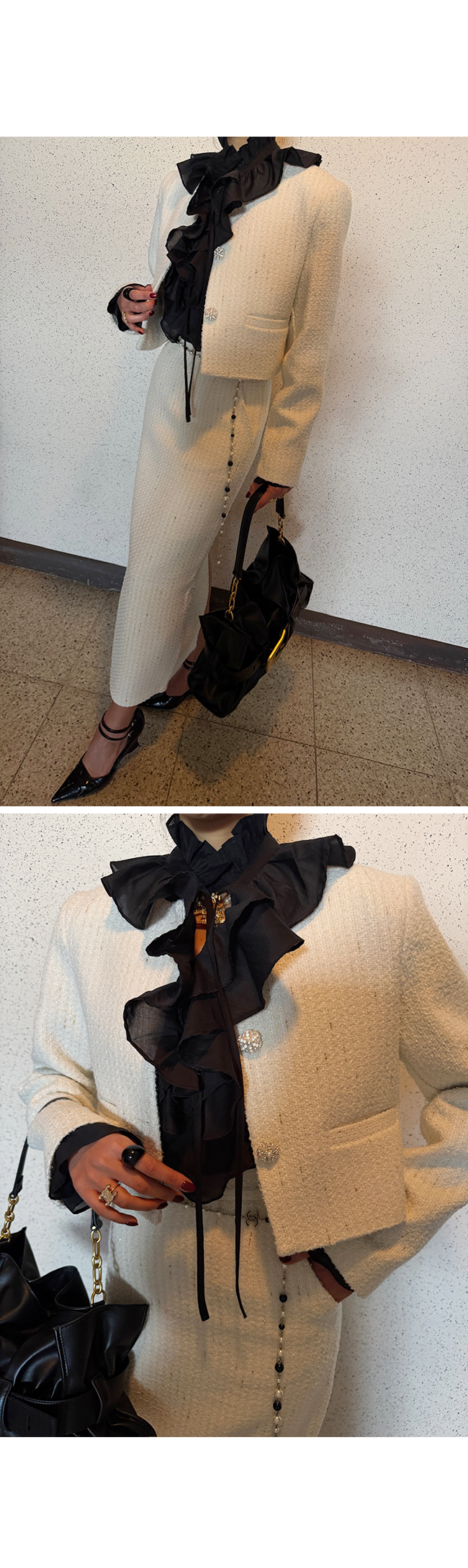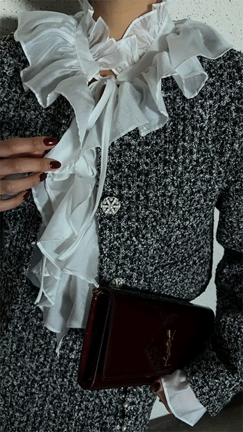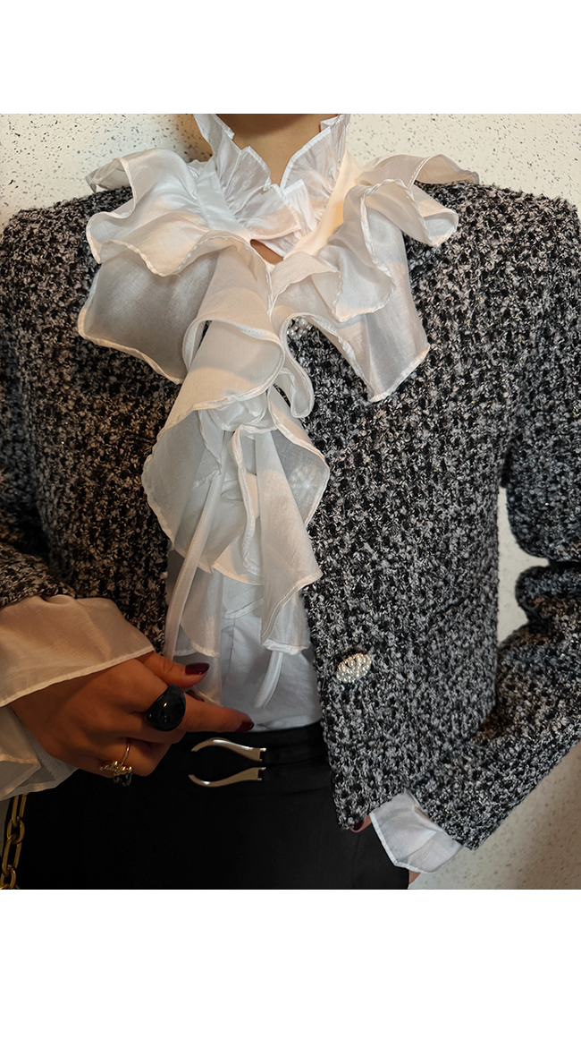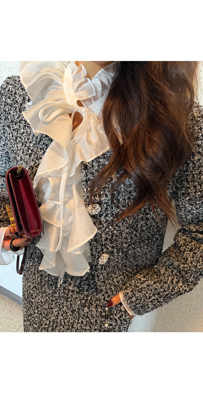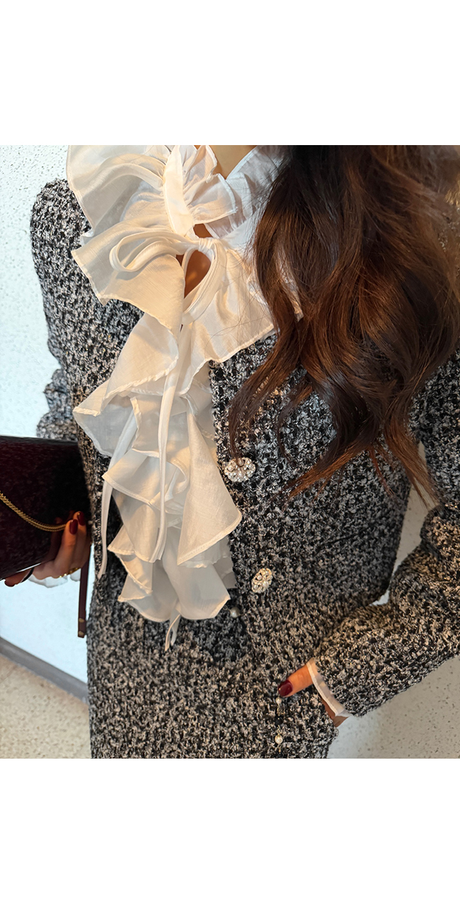 넥 라인을 따라 풍성하게 흐르는 프릴 디테일이