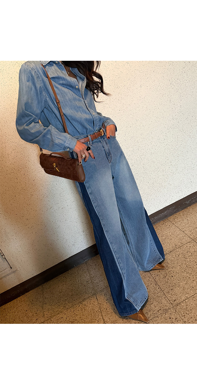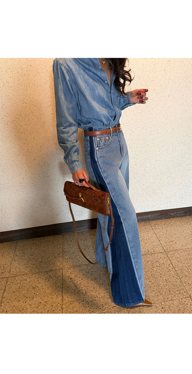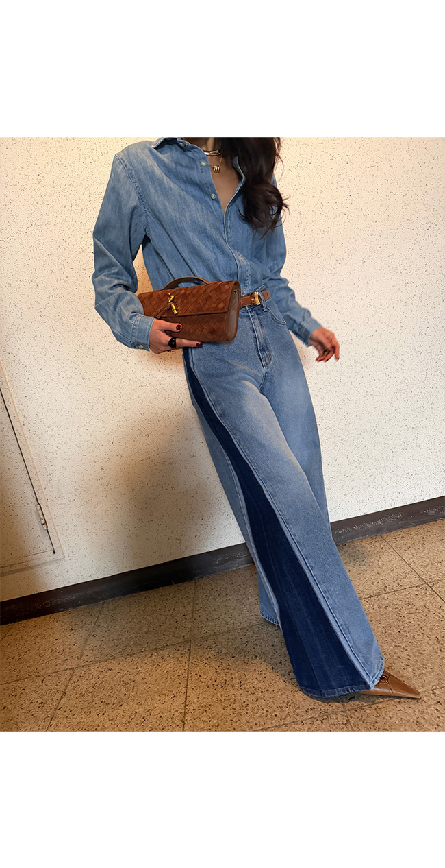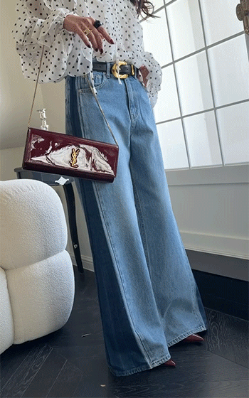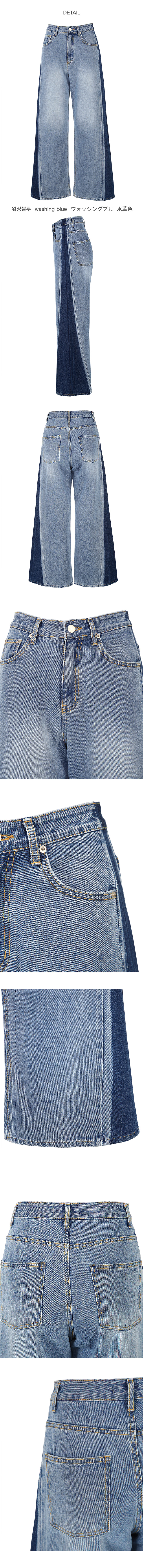 폭넓게 활용하기 좋은 배색 데님 팬츠로