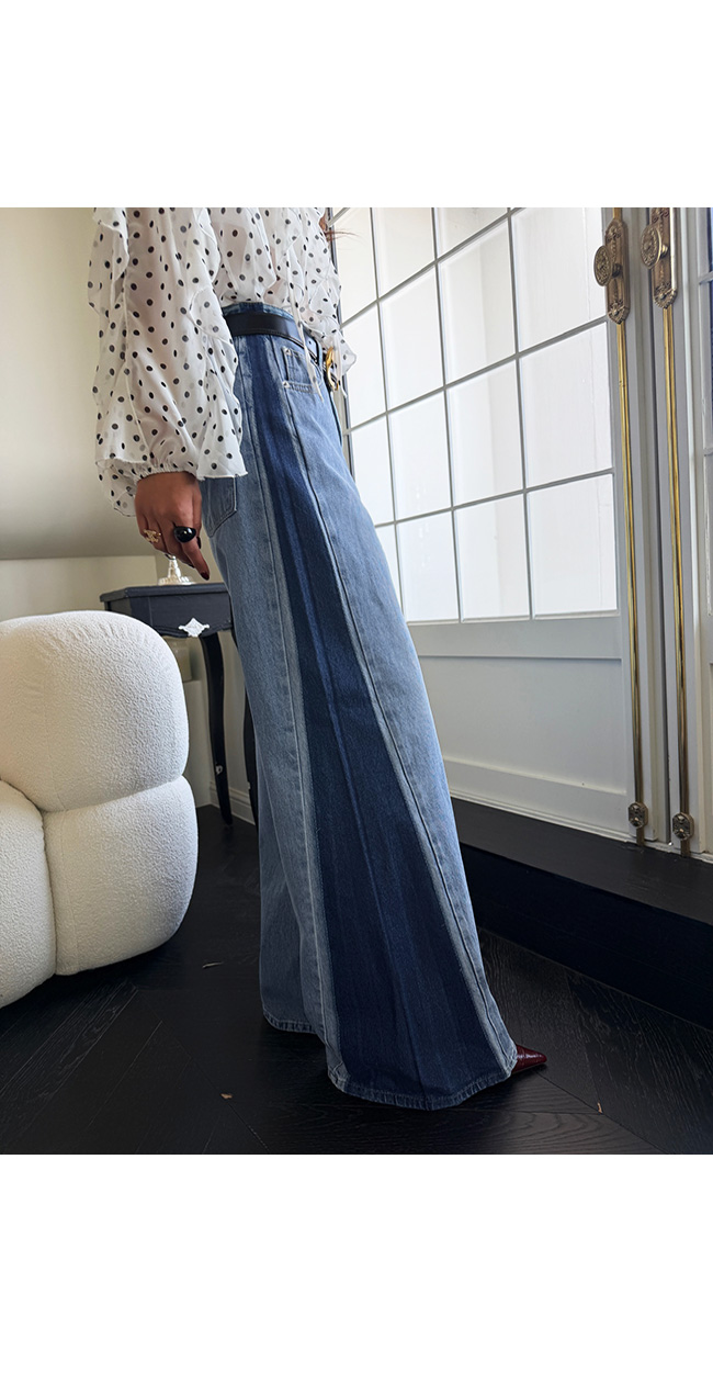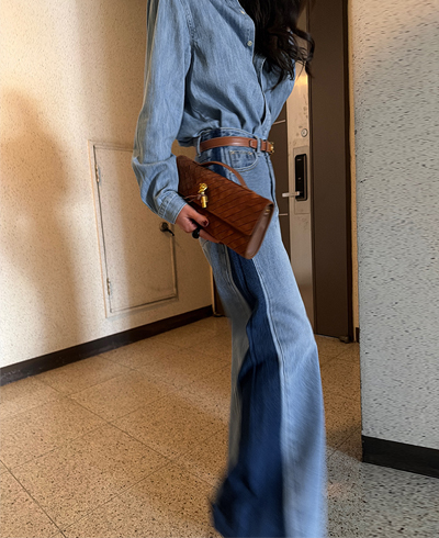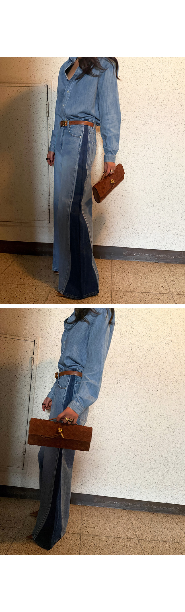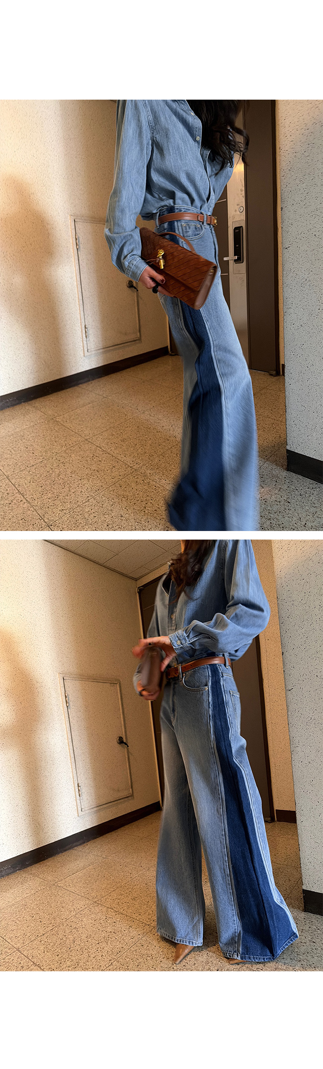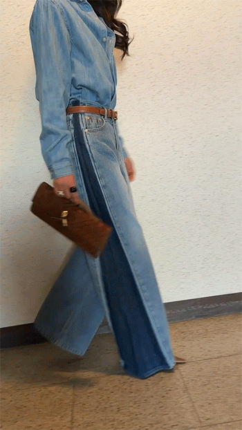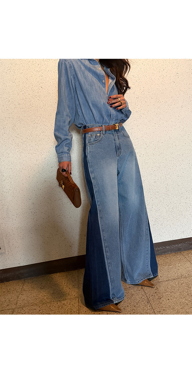 폭넓게 활용하기 좋은 배색 데님 팬츠로