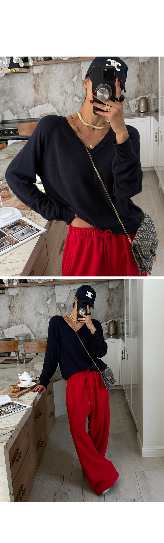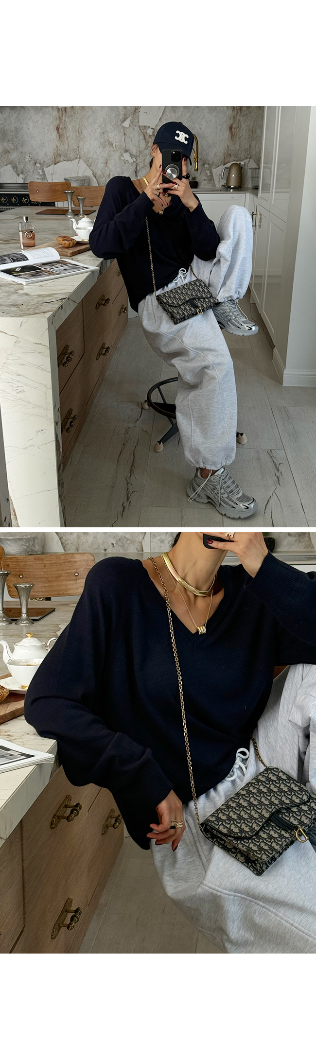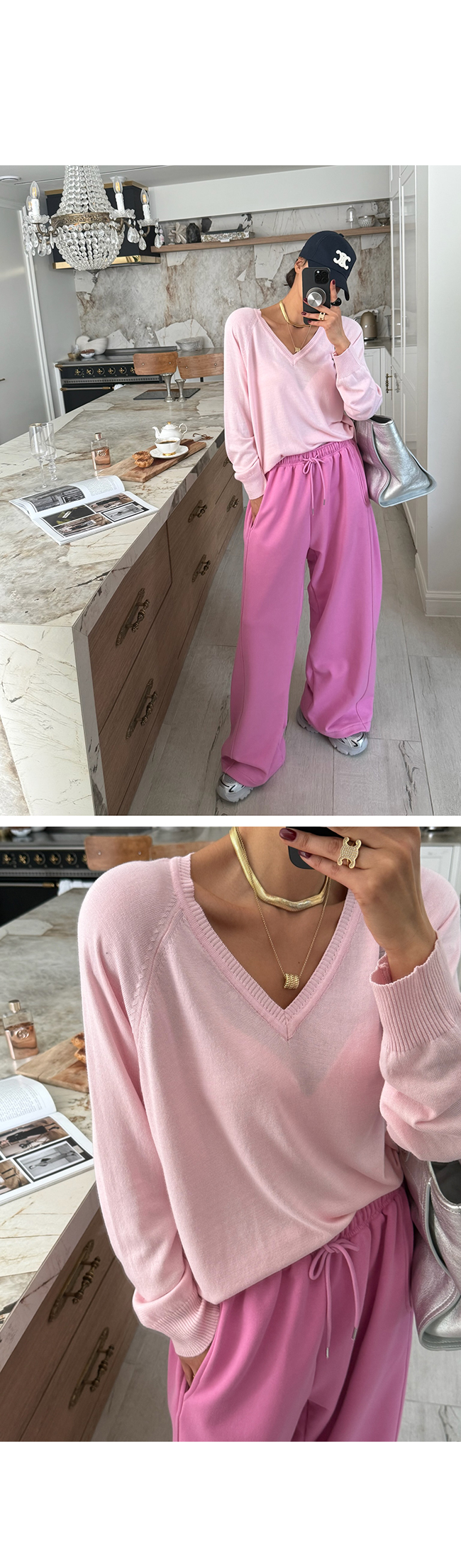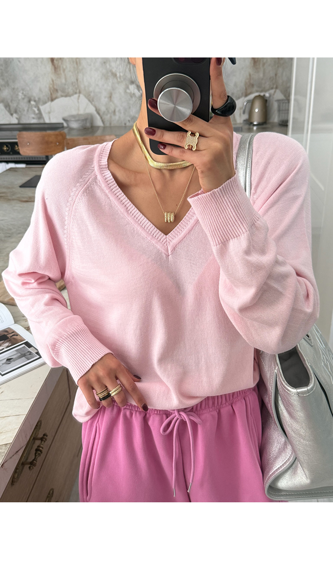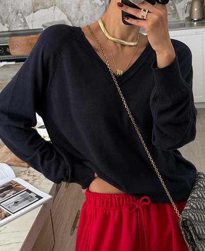 쇄골 라인을 예쁘게 드러내는 브이넥 디자인으로