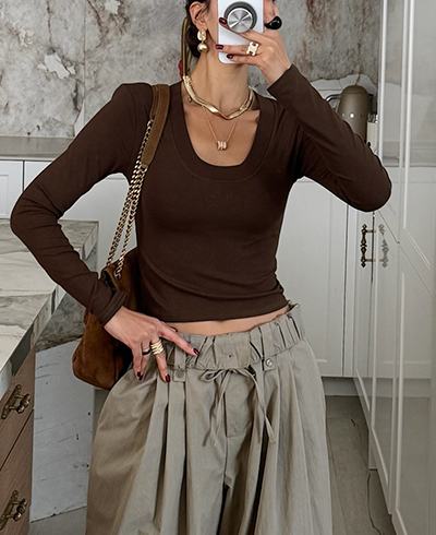 쇄골 라인을 은은하게 드러내 여성스럽고 세련된 무드를 더해주며,