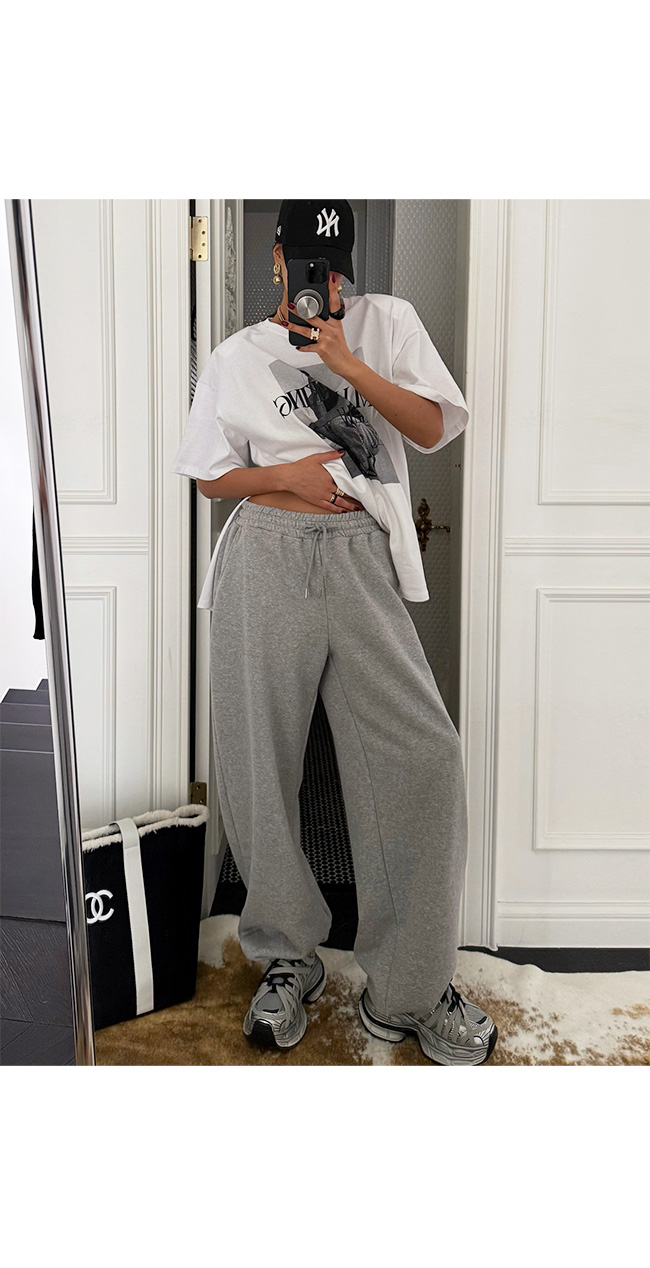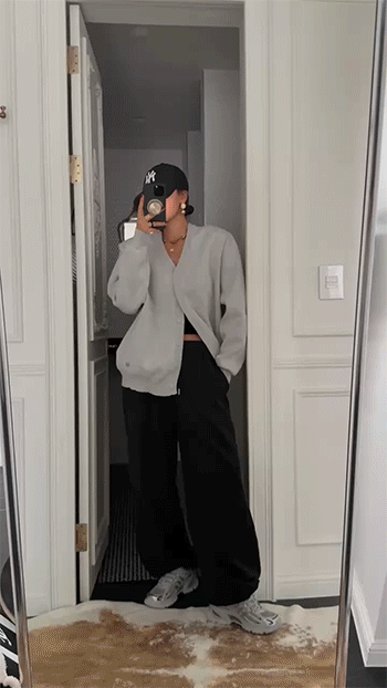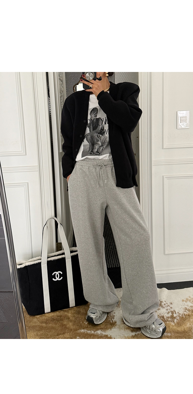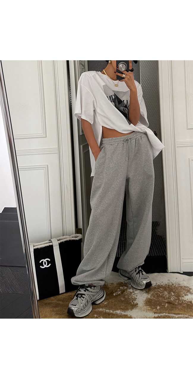 여유 있게 떨어지는 와이드 핏이 하체 라인을 자연스럽게 커버해