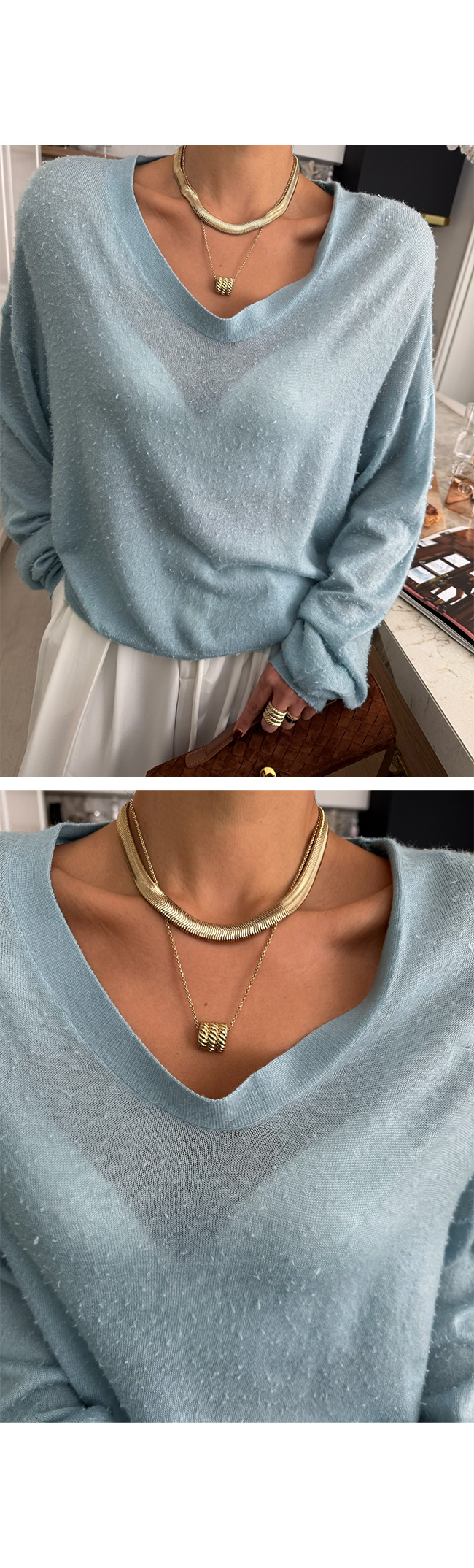 쇄골 라인이 살짝 드러나는 넥 라인과