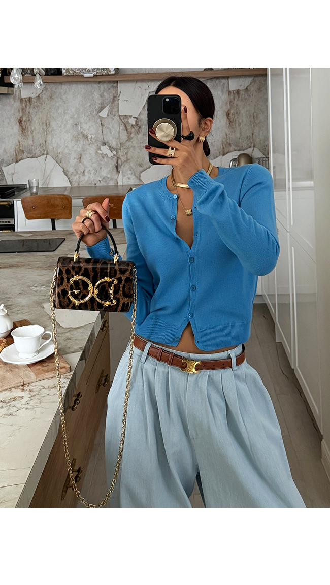 과하지 않게 정돈된 라운드 네크라인과 깔끔한 버튼 디테일이