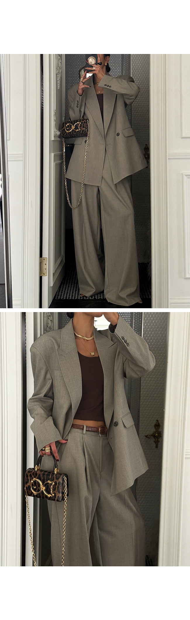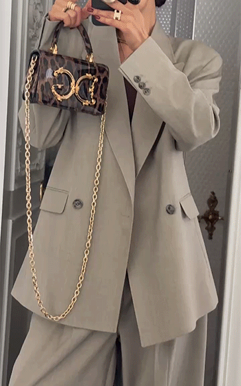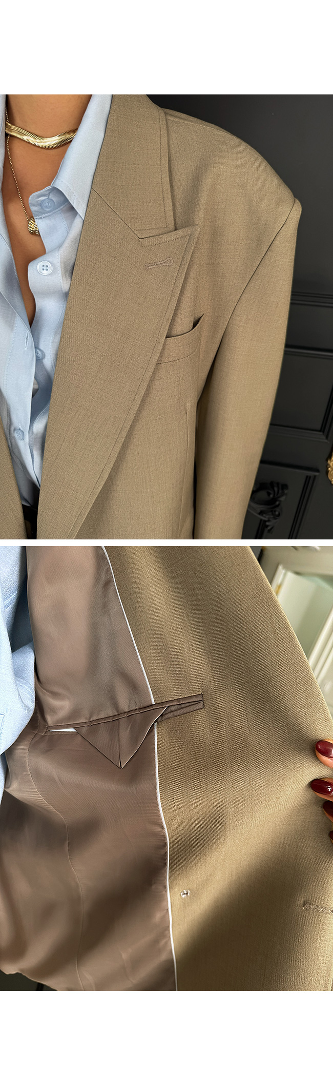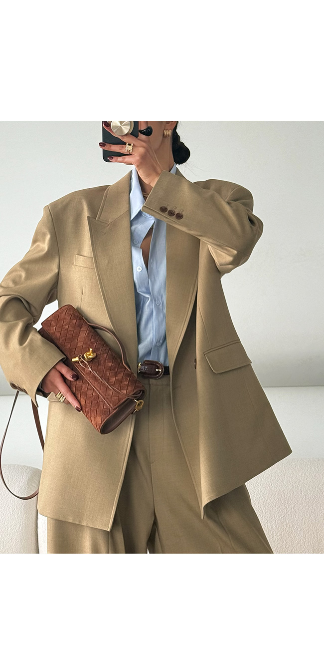 더블 브레스트 디자인과 넓은 라펠 디테일이