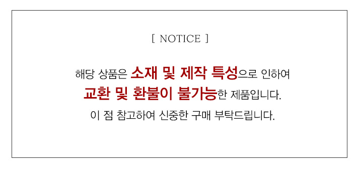 - 기재된 세탁방법과 다르게 세탁시 절대 교환,반품이 불가합니다.