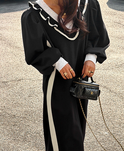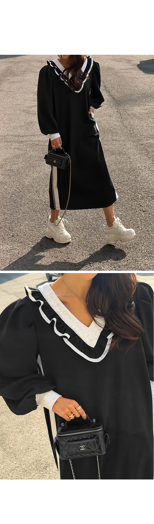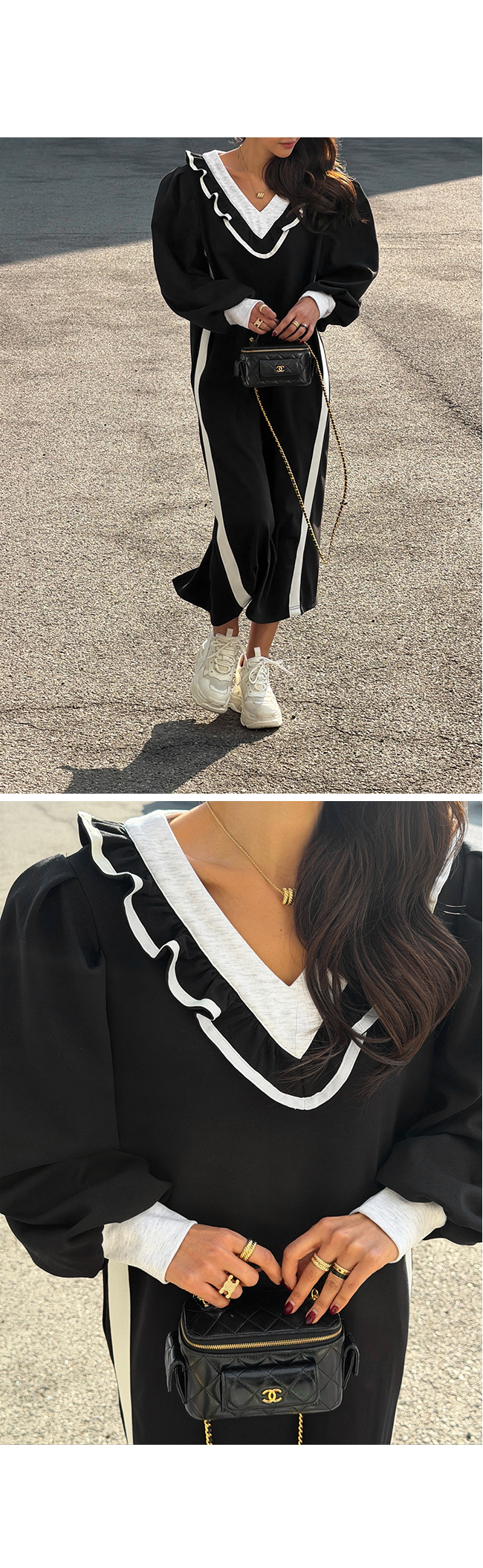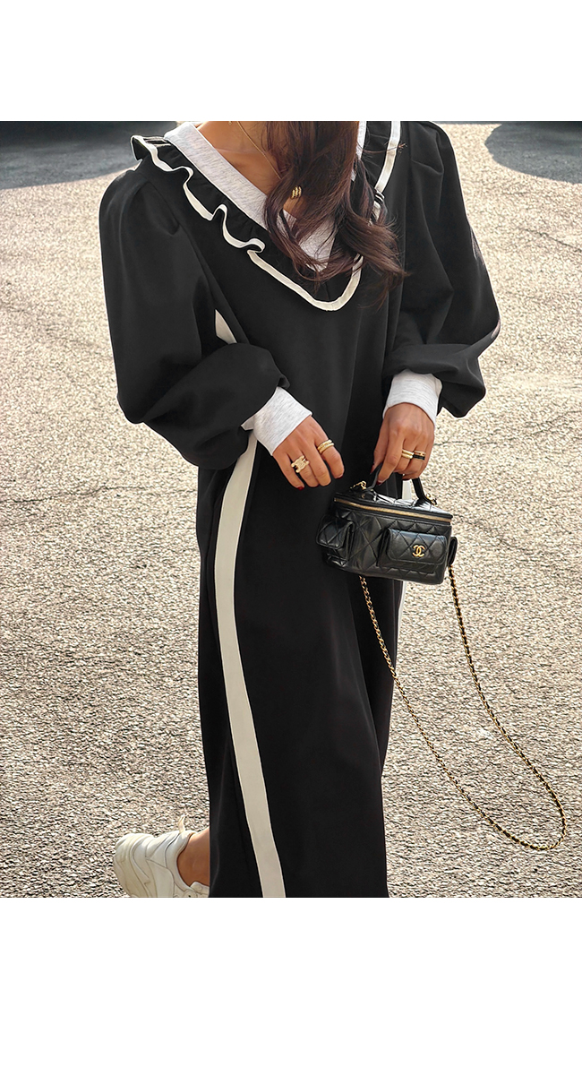넥라인을 따라 더해진 프릴 디테일과 배색 라인이