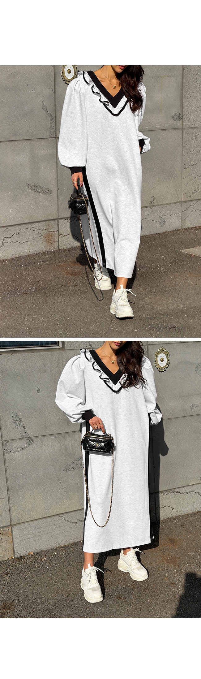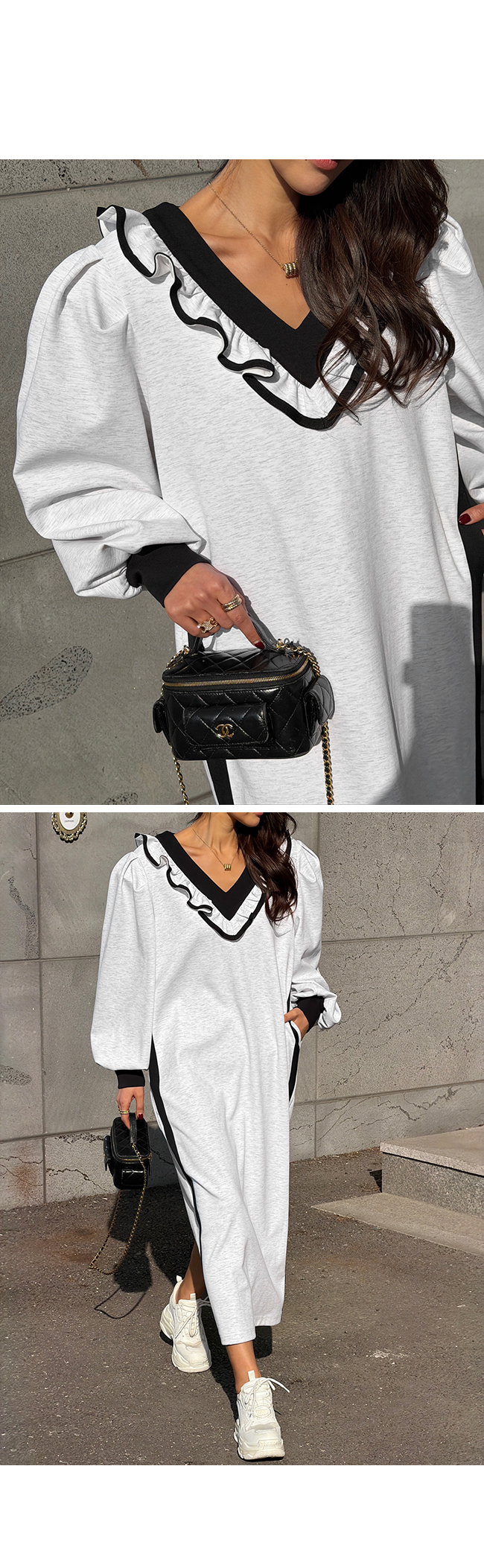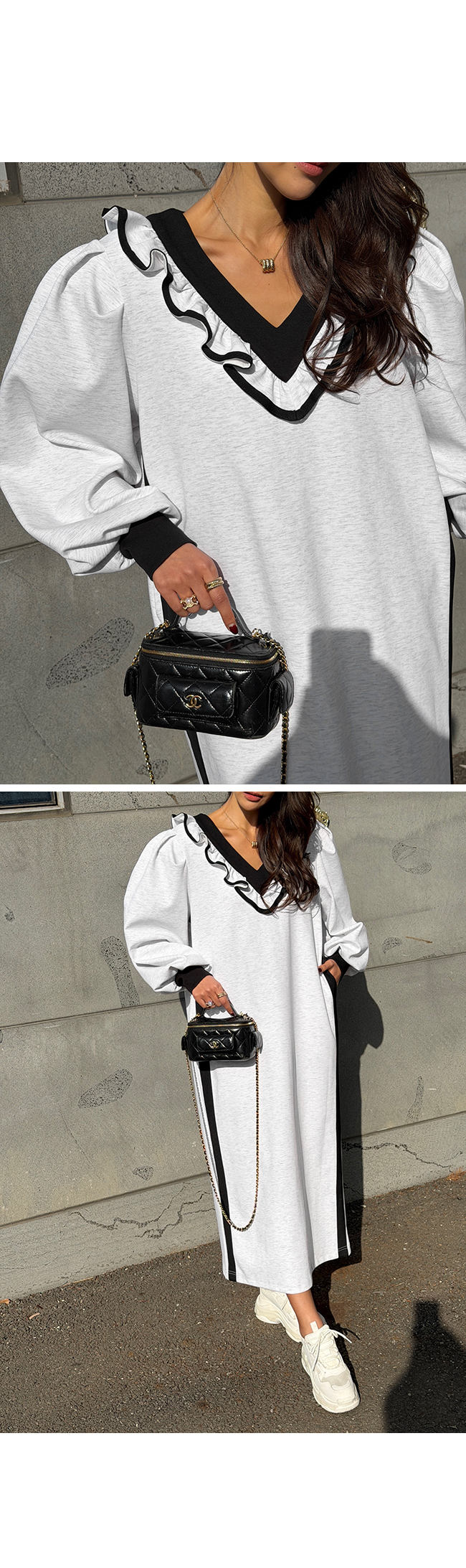 넥라인을 따라 더해진 프릴 디테일과 배색 라인이