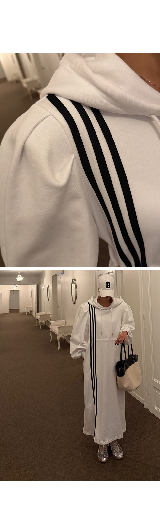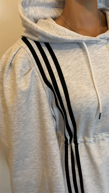 넥라인에는 캐주얼한 후드 디테일과 스트링이 더해져