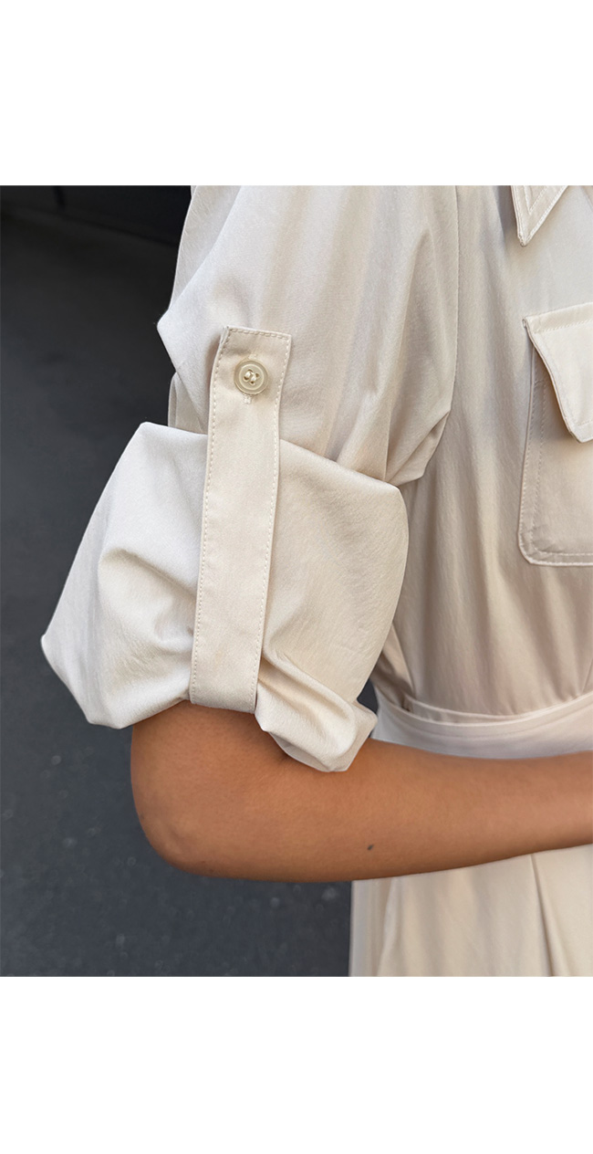소매에는 롤업 후 고정할 수 있는 버튼 스트랩 디테일이 더해져