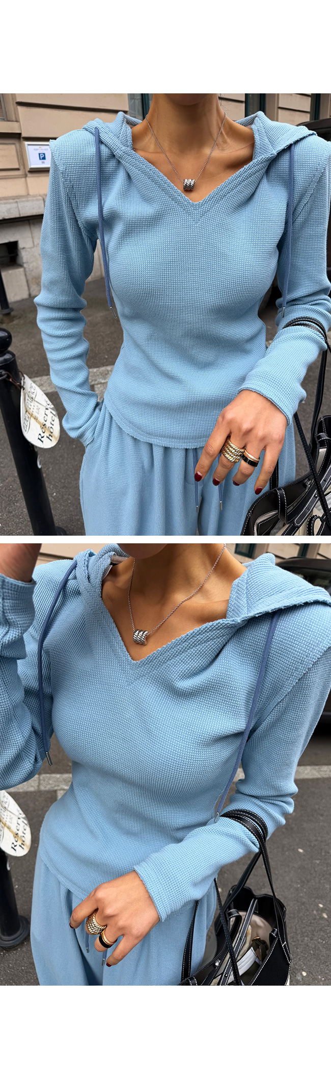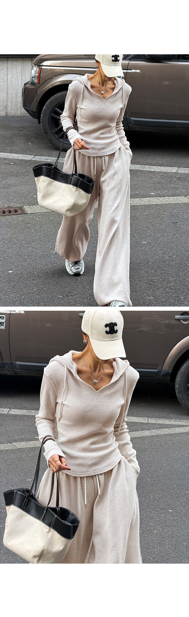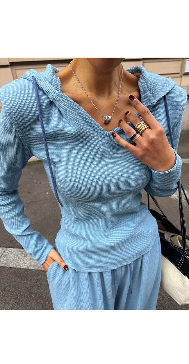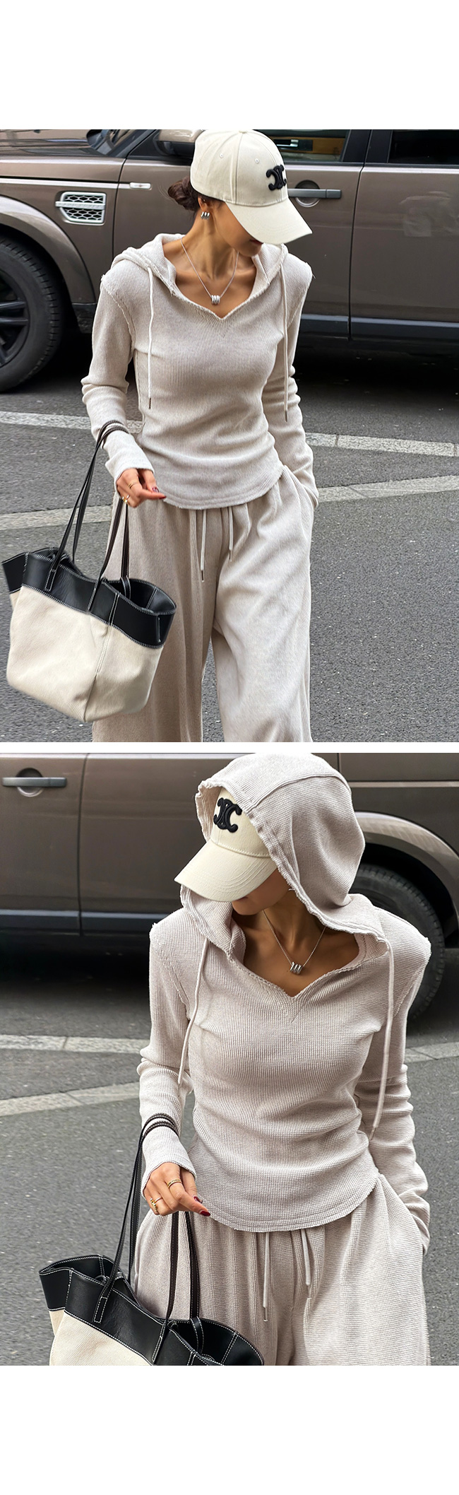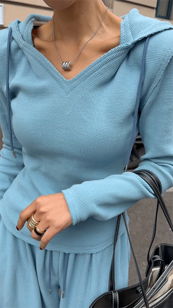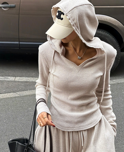 목선을 예쁘게 드러내주는 브이넥 후드 디자인으로