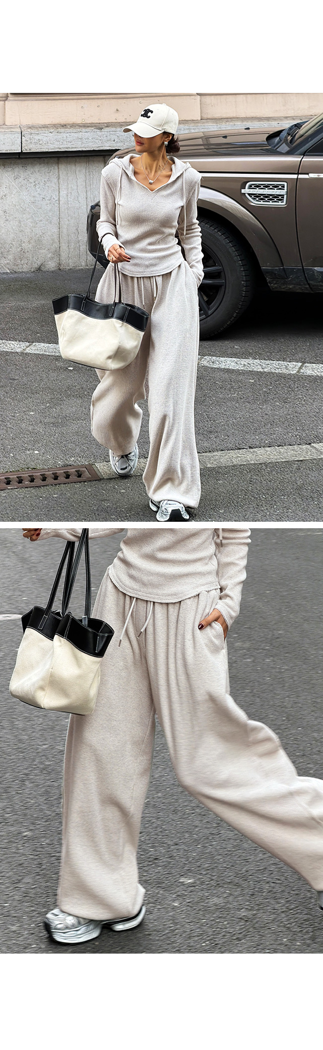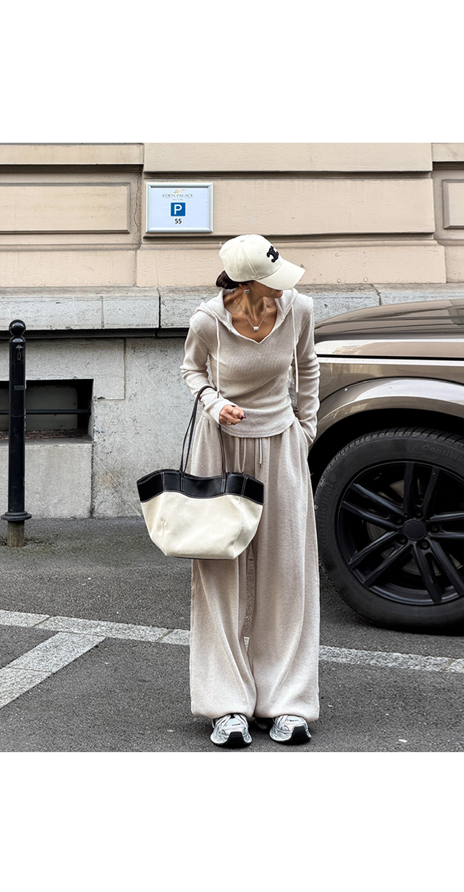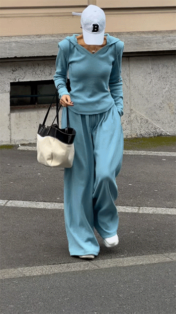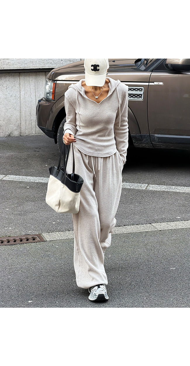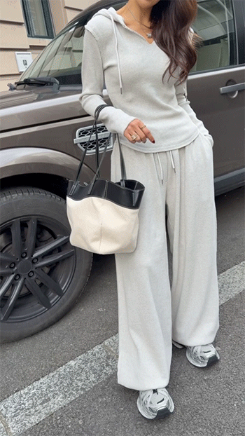 같은 원단의 팬츠와 셋업으로 연출하면