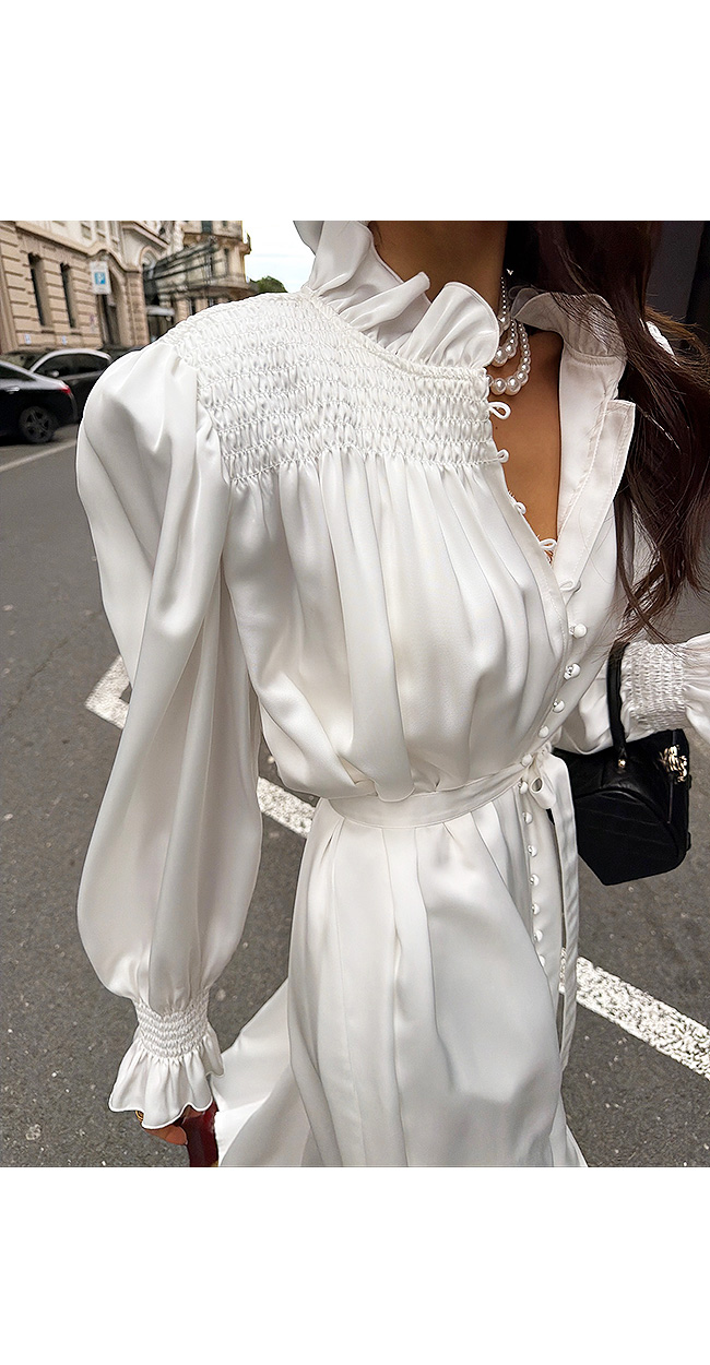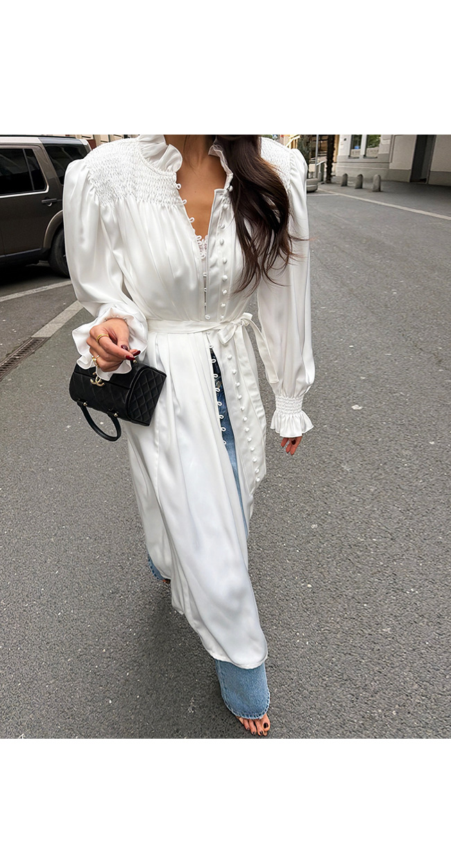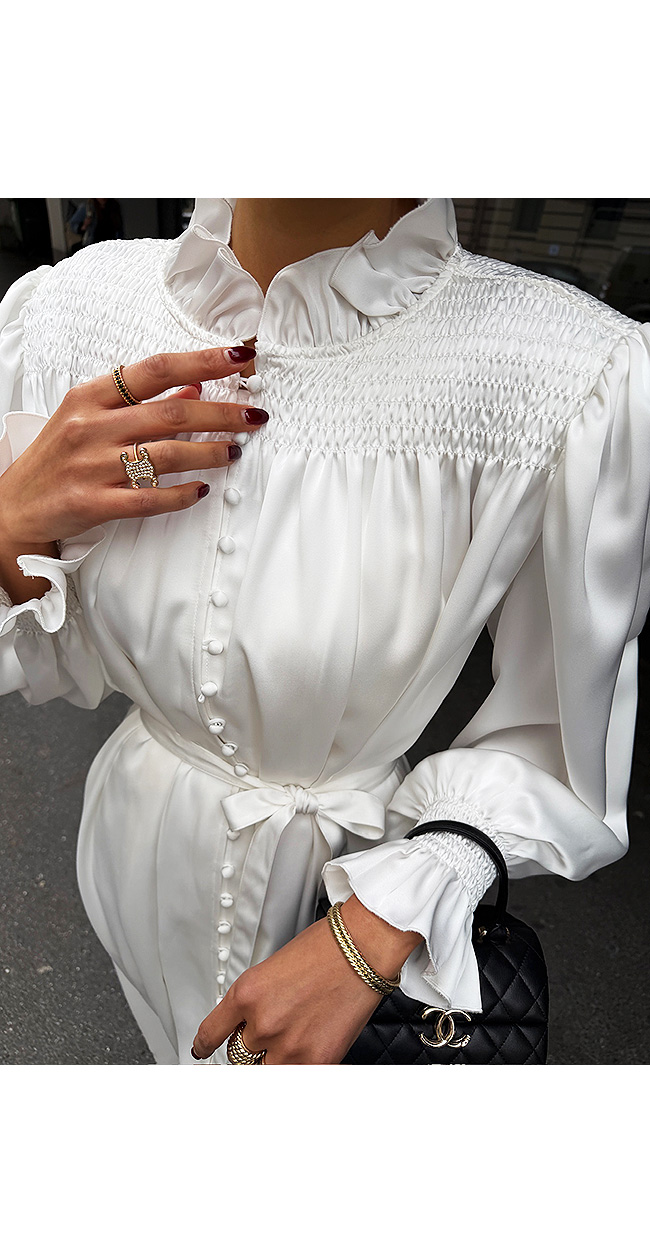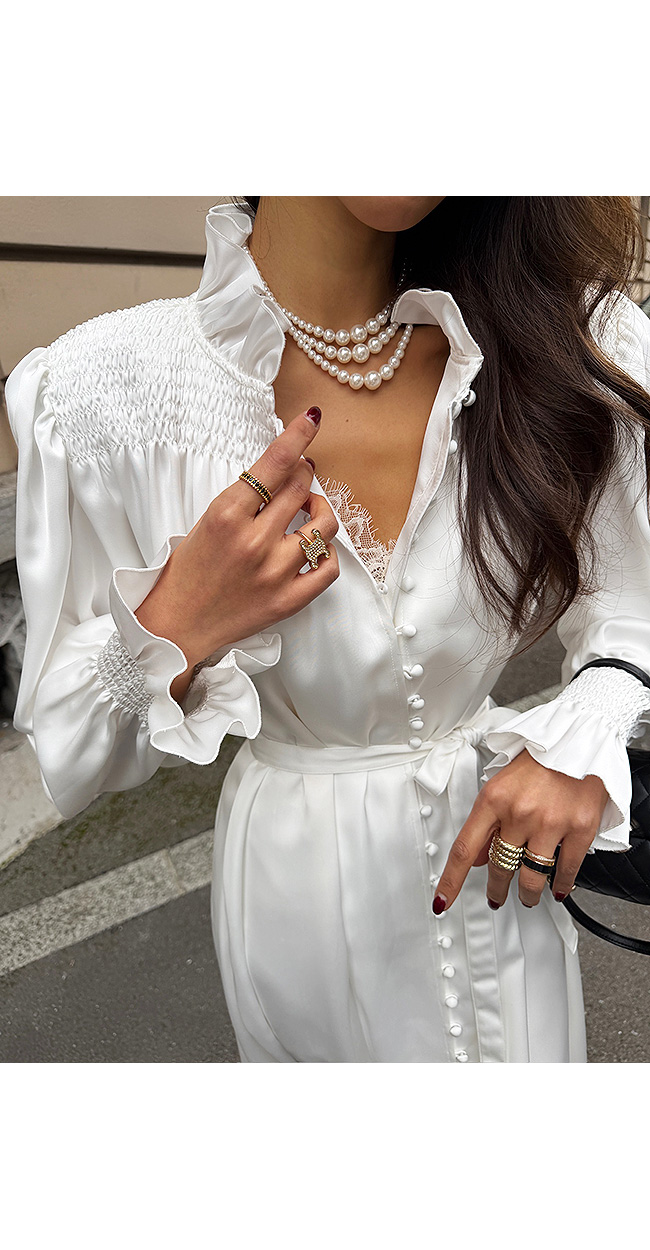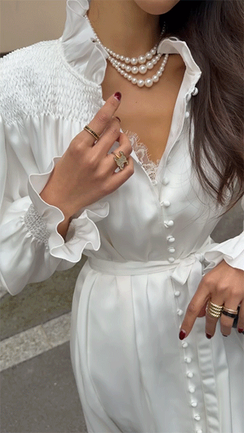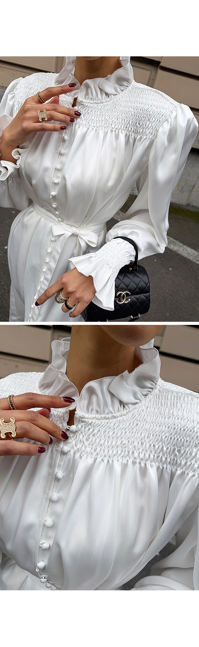 소매 끝에는 셔링 밴딩과 프릴 커프스 디테일을 더해
