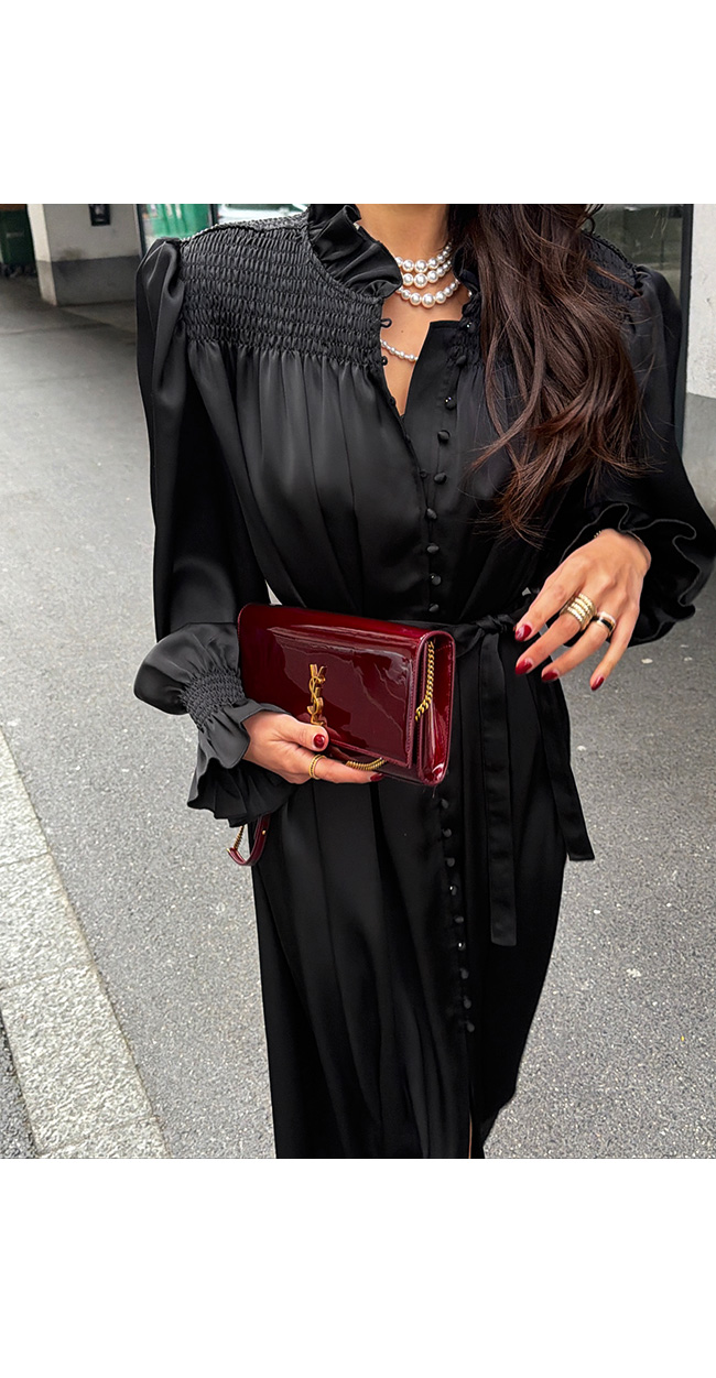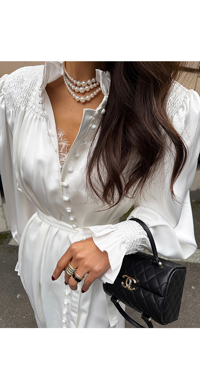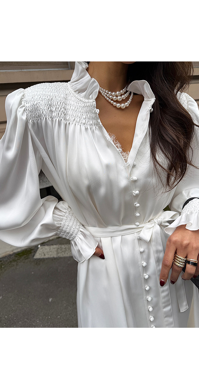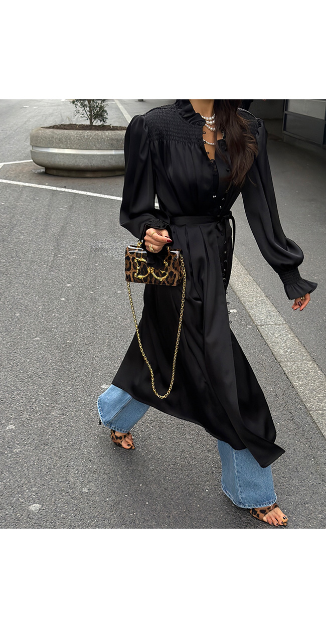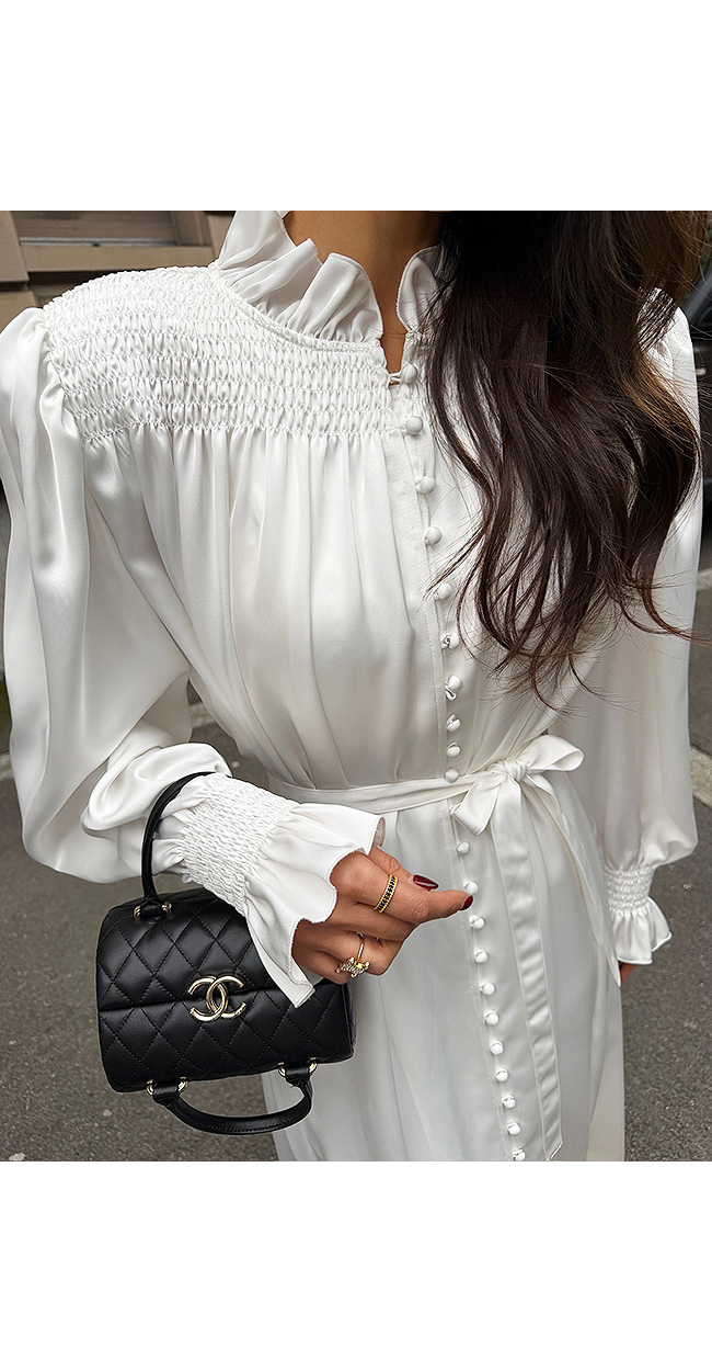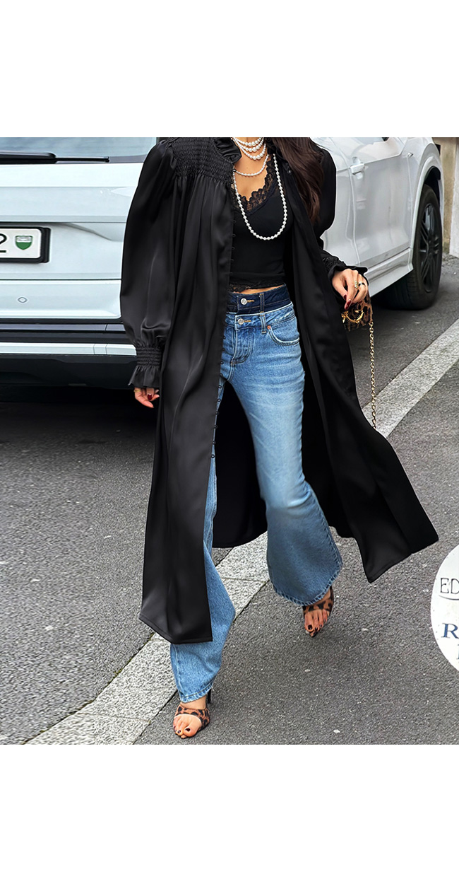 소매 끝에는 셔링 밴딩과 프릴 커프스 디테일을 더해
