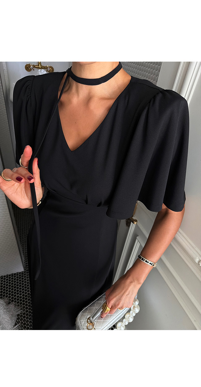 어깨 라인에는 잔잔한 셔링과 볼륨감 있는 소매 디테일이 더해져