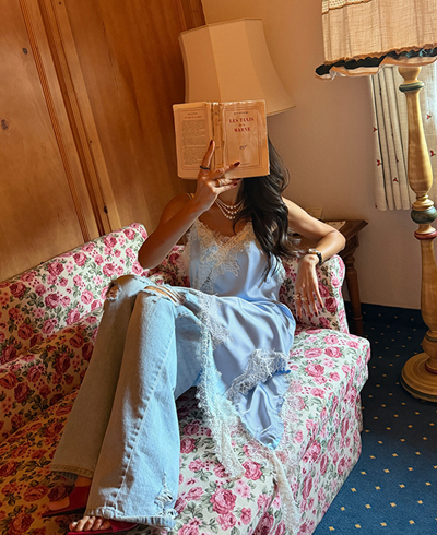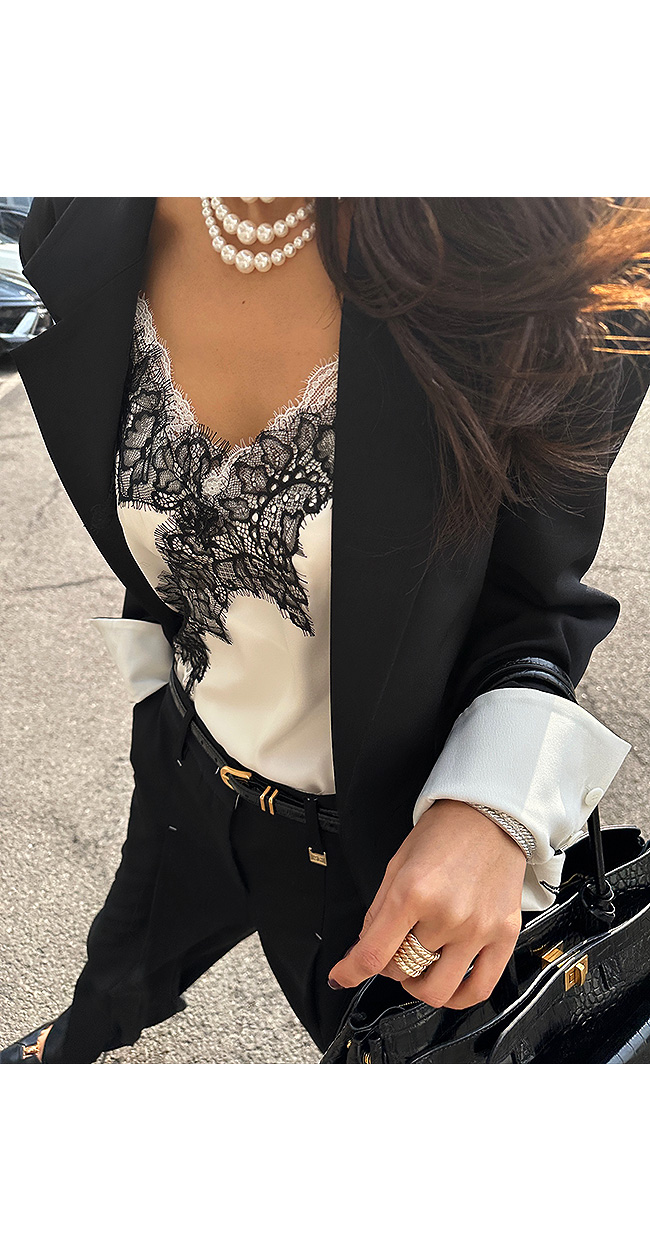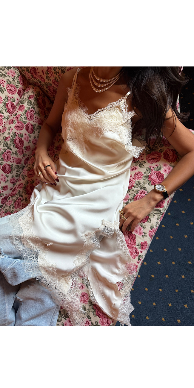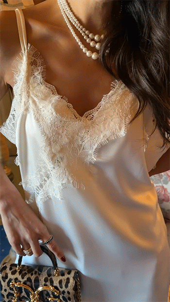넥라인과 바스트 라인을 따라 더해진 레이스 디테일이