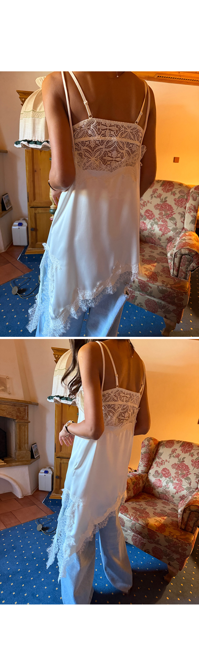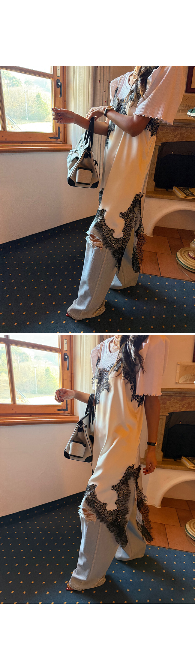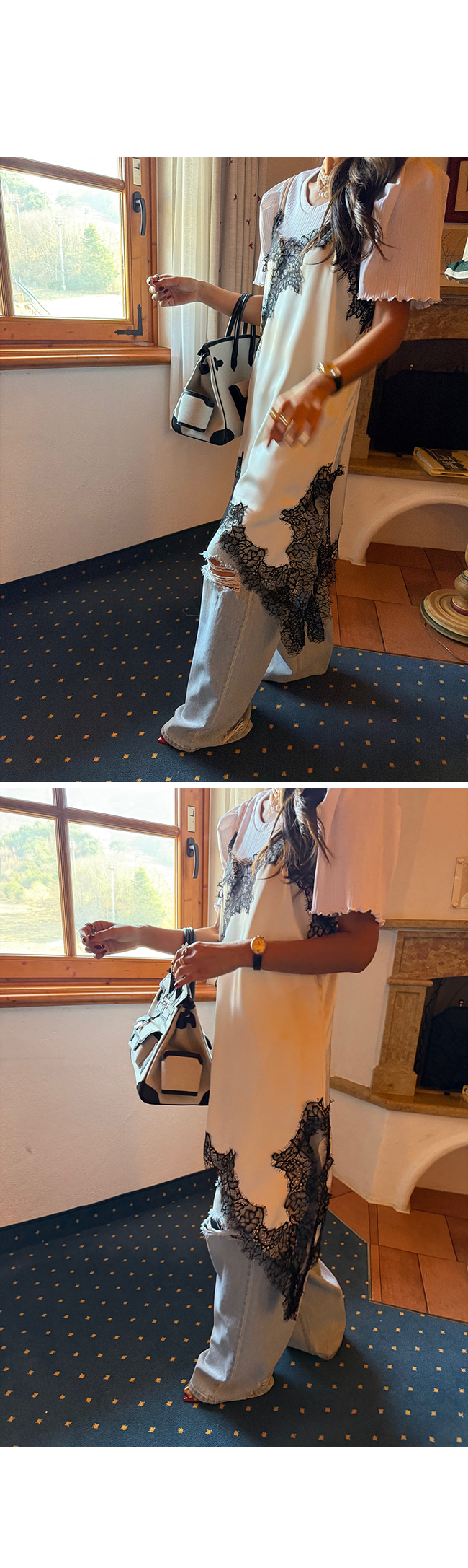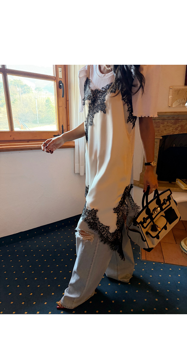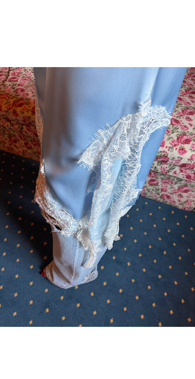 밑단은 언발란스하게 떨어지는 레이스 트리밍으로 마무리되어